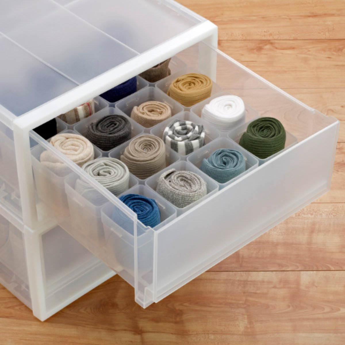 靴下整理カップを使用して1足ずつ収納することで、迷子になりがちな靴下を見つけやすくスムーズに取り出せます。靴下以外にも、下着やタイツ、ネクタイ、ハンカチなども収納でき、引き出しの中がきれいに整います。
