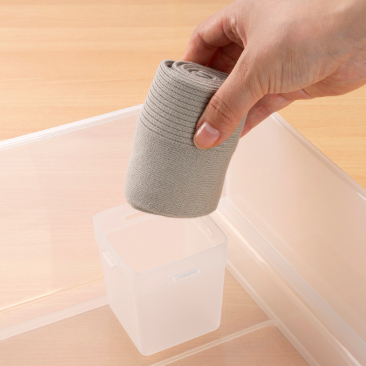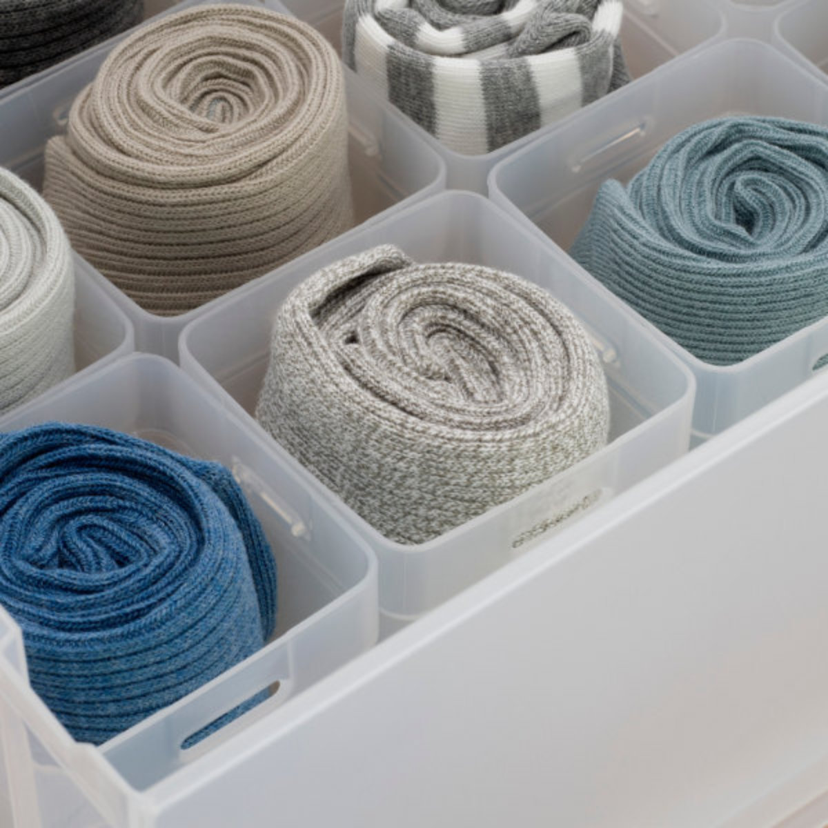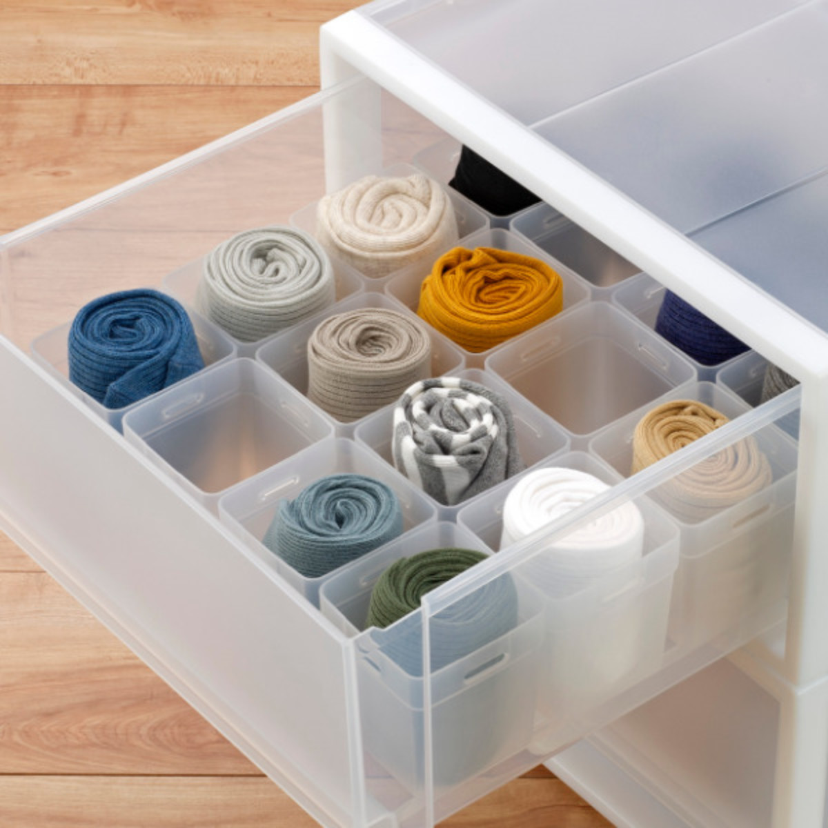 7.4cm角の整理カップで、靴下の数や引き出しのサイズに合わせてタテ・ヨコに並べて連結可能です。収納スペースを無駄なく活用できます。