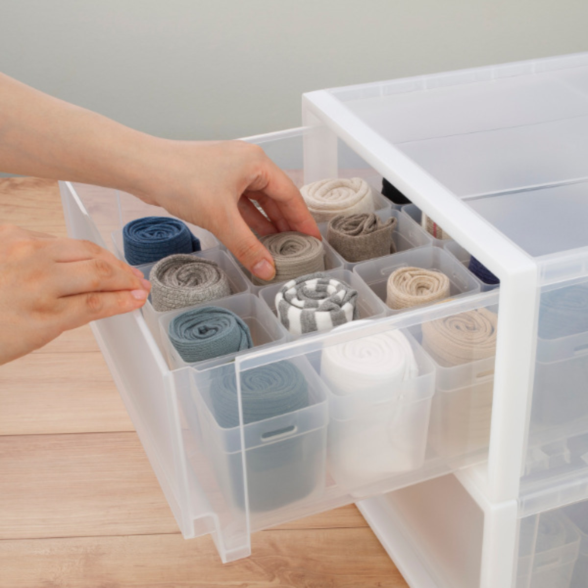衣類以外にも化粧道具やアクセサリー、薬、キッチン小物など細々したものを種類ごとに収納できます。必要なものが一目で見つかり、さっと取り出せてとても便利です。使用用途を問わず、アイデア次第で様々な使い方が可能です。
