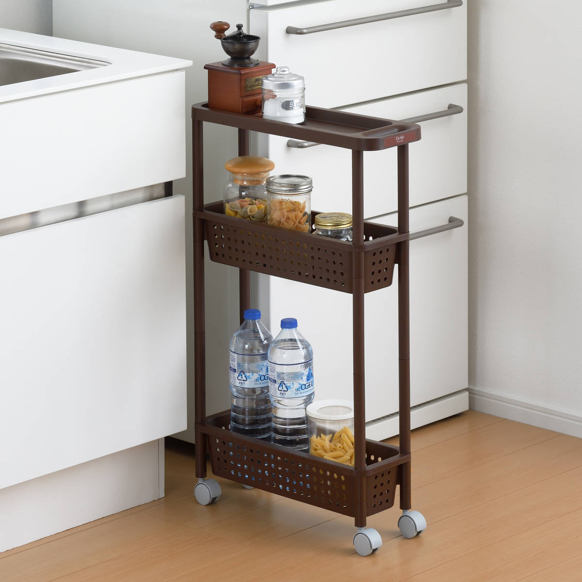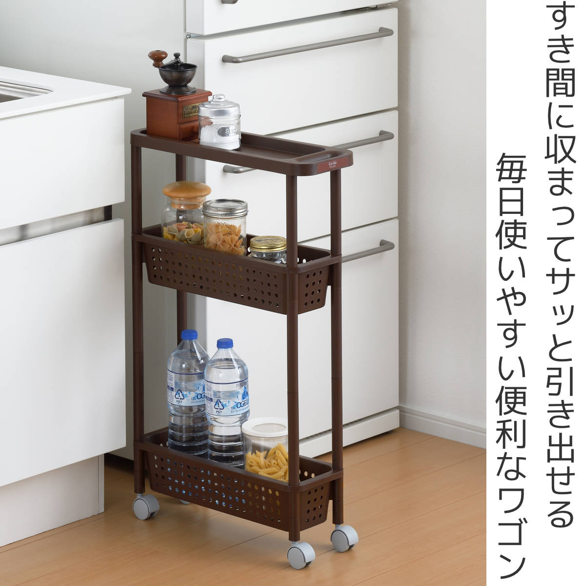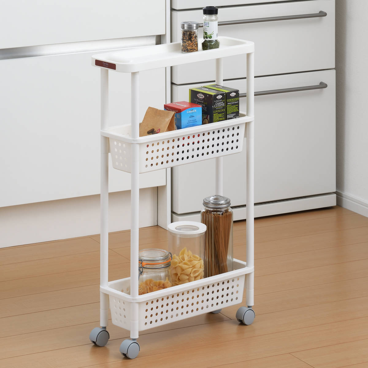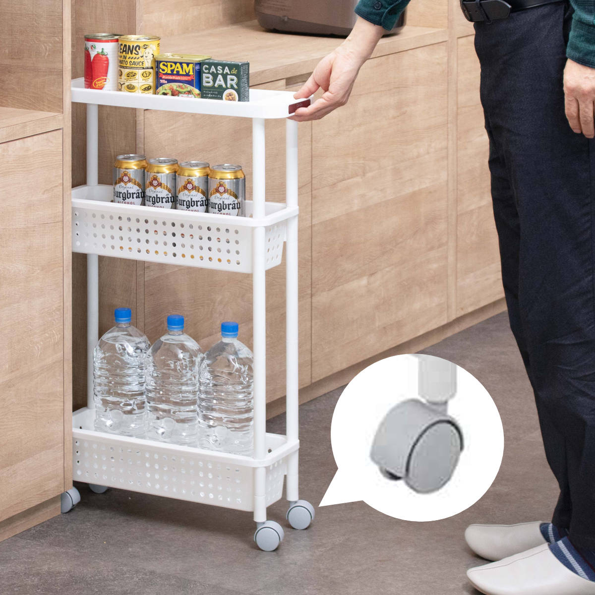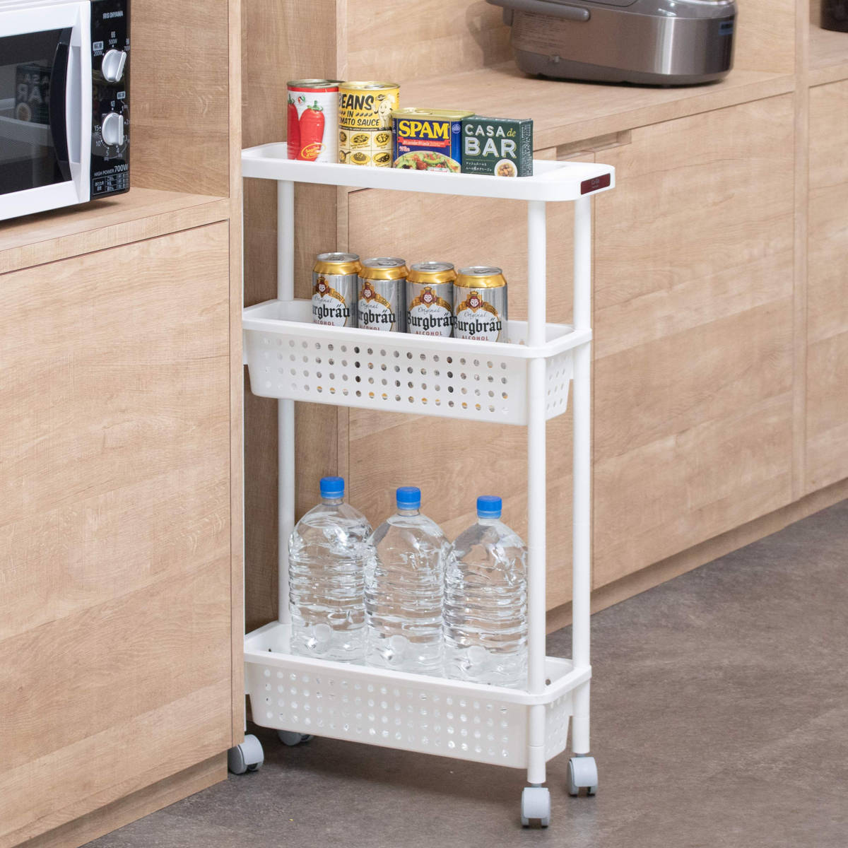 キッチンと冷蔵庫の間のちょっとした隙間にすっぽり収まる、スリム設計なキッチンワゴンです。缶詰やパスタ、調味料などのストックに便利で、これまで活用しきれなかったスペースを収納に変えられます。