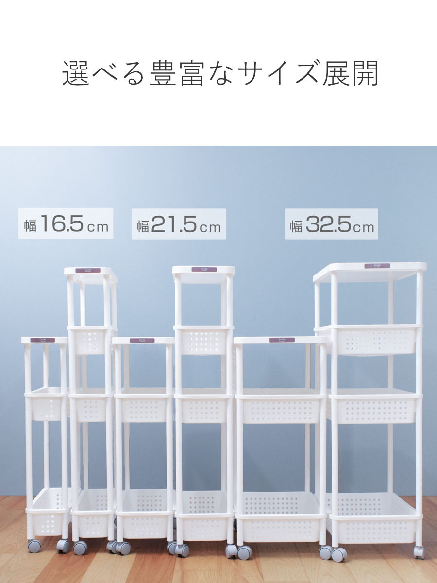 16.5/21.5/32.5cmの3つの幅のサイズがあり、それぞれ3段・4段タイプからお選びいただけます。設置スペースや用途に合わせて、ぴったりのサイズが見つかります。