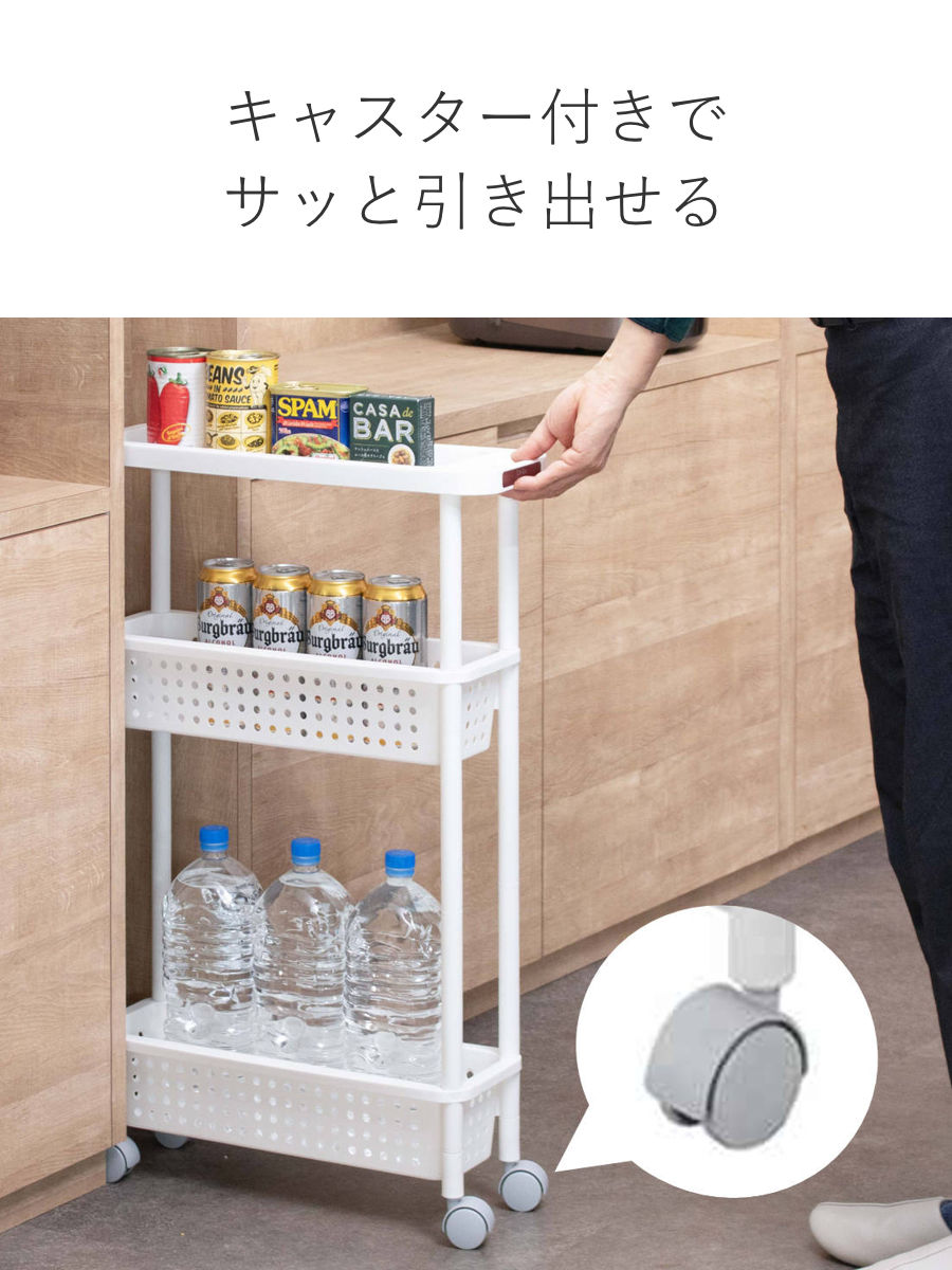 本体をサッと引き出せるキャスターが付いていて、奥の物もストレスなく取り出し可能。移動も簡単だから、すき間のお掃除もラクに行えます。
