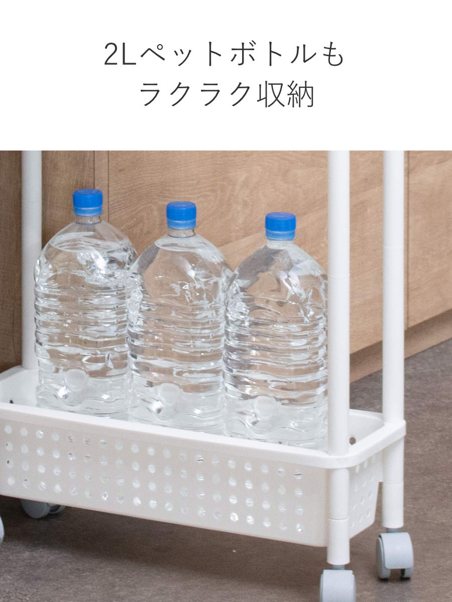 最下段には2Lペットボトルや背の高い調味料ボトルも立てて収納可能です。高さのある容器も安定して収まり、キッチン周りを快適に保てます。