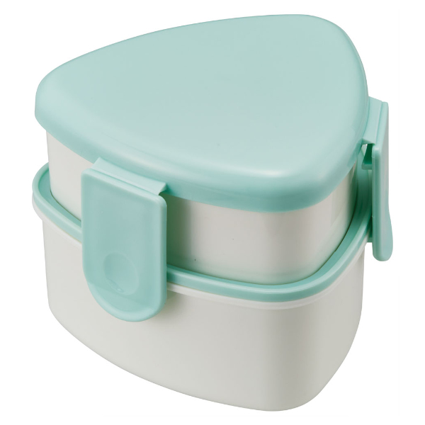 小さな三角型のシンプルな2段お弁当箱です。コンビニの三角おにぎり1個が袋のまま入るサイズで、容量は上段が230ml、下段が270mlの総容量500mlです。上段、下段共にご飯がくっつかない加工が施されています。