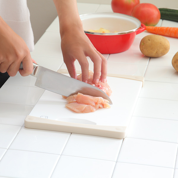 左右にまな板の滑りを抑えるストッパーがついているので、安全に食材を切ることができます。抗菌加工がされているので、衛生的に使用でき、まな板に押印されたマークで、表と裏とを使い分けることもできます。