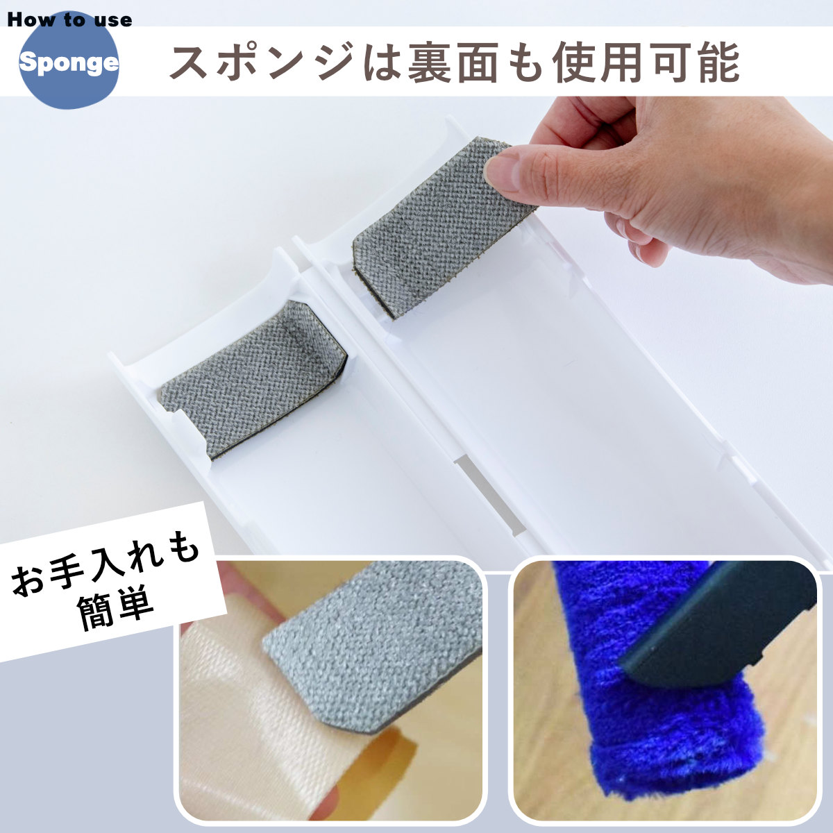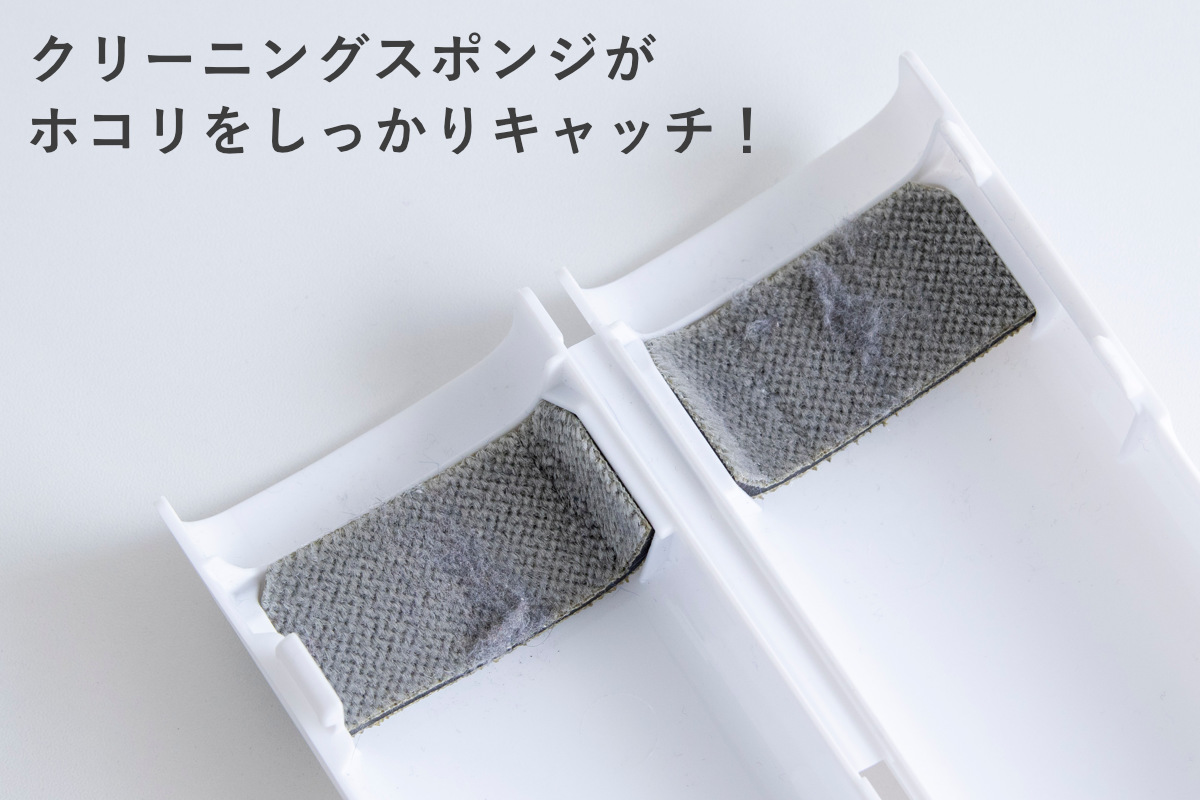 クリーニングスポンジは両面仕様で、ひっくり返してキレイな面を使えます。 汚れが目立ってきたらテープや掃除機でお手入れできます。