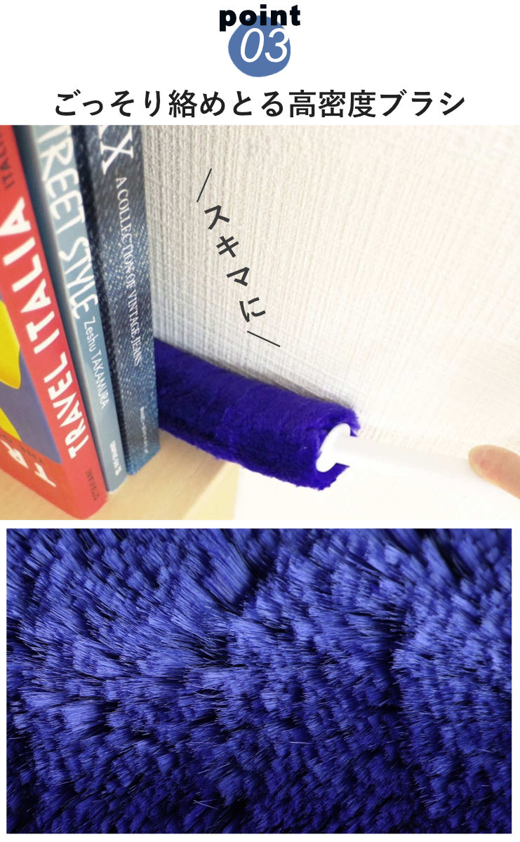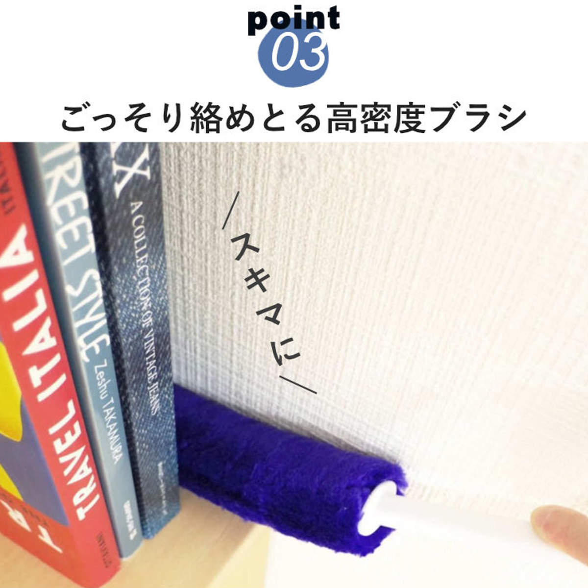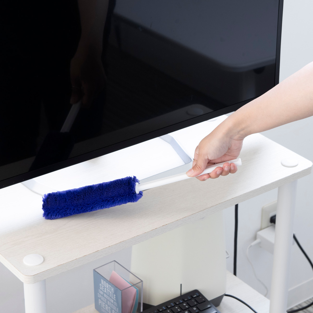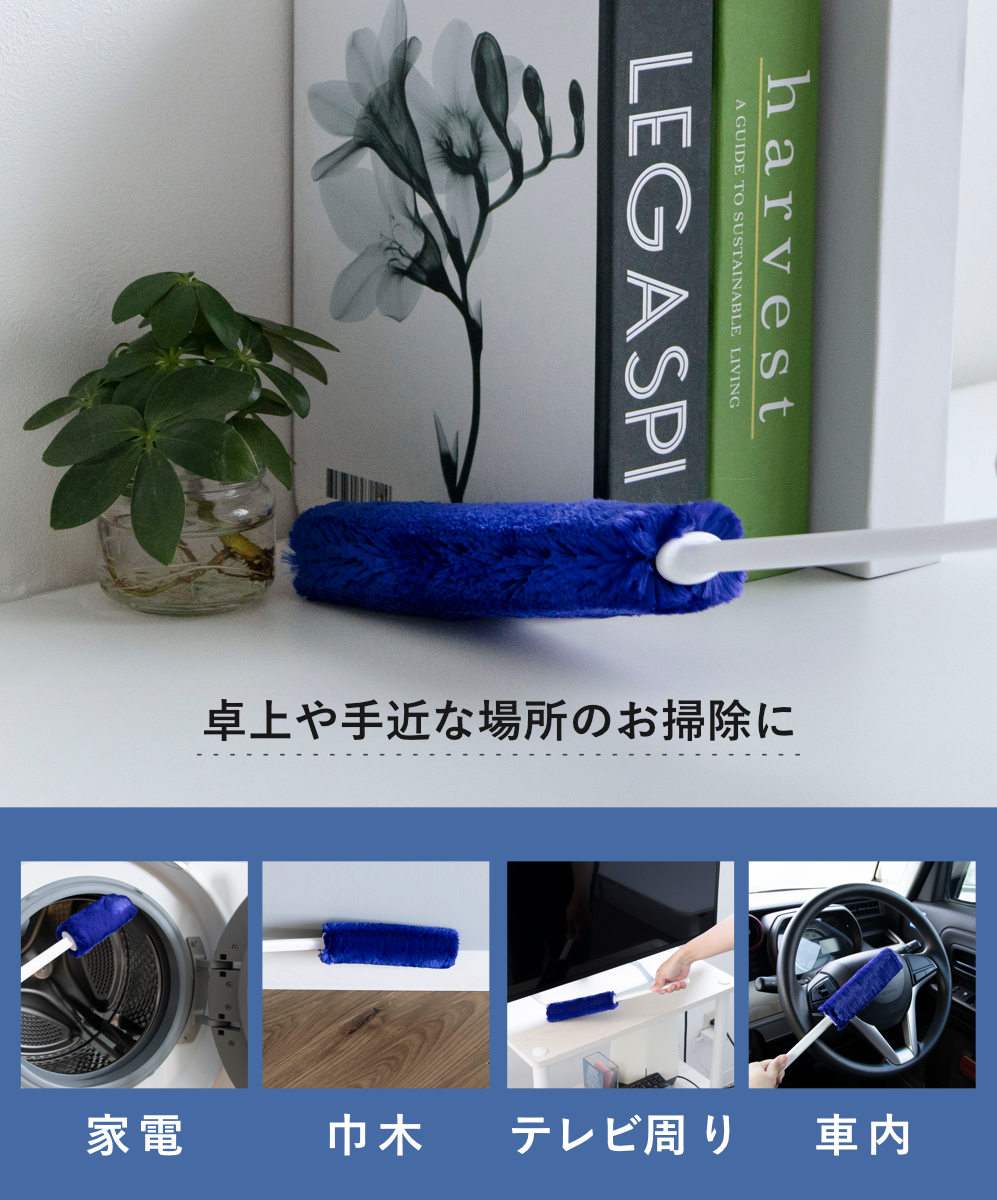 高密度繊維のモップが、細かなホコリまでしっかりキャッチ。 スリムな形状と程よいしなりで、テレビ台や本棚のすき間にもスッと入り込み、溜まった汚れをしっかり落とします。