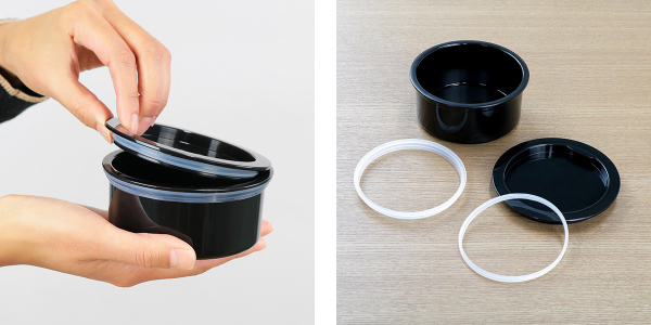| 中蓋はつまみ付きで開けやすい 中蓋にはつまみが付いているので、指をかけて開けやすいです。 | パッキン付きで汁もれしにくい 中容器、中蓋にはパッキンが付いているので汁もれしにくく持ち運ぶ時も安心です。 |