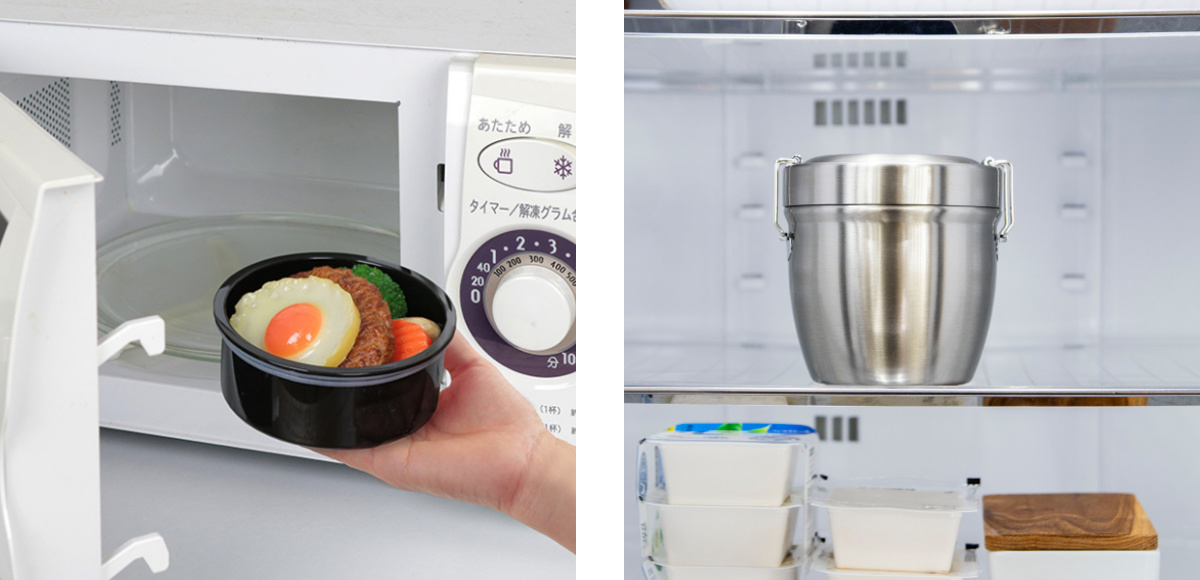 | 中容器は電子レンジOK 中蓋を外せば中容器は電子レンジで温めなおすことができます。 | 簡単保冷効果アップ 事前に冷蔵庫で冷やしておき、美味しい冷製麺ランチも楽しめます。 |