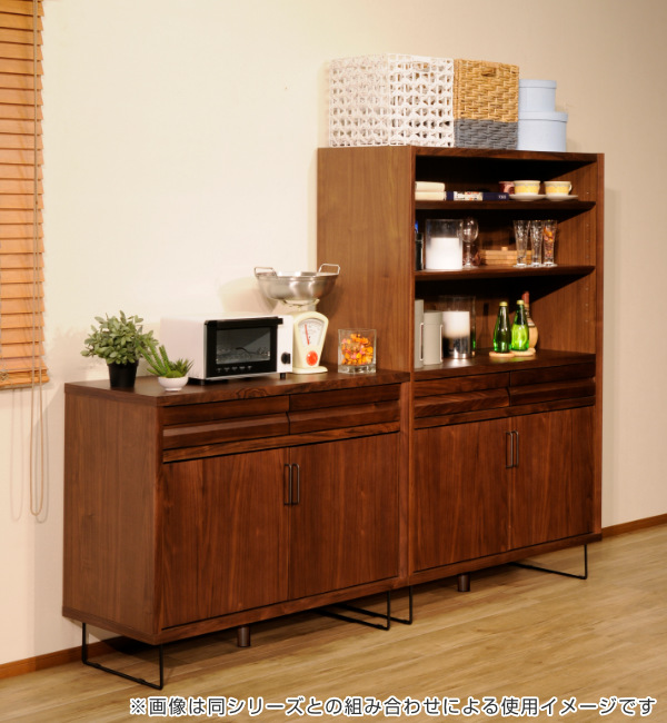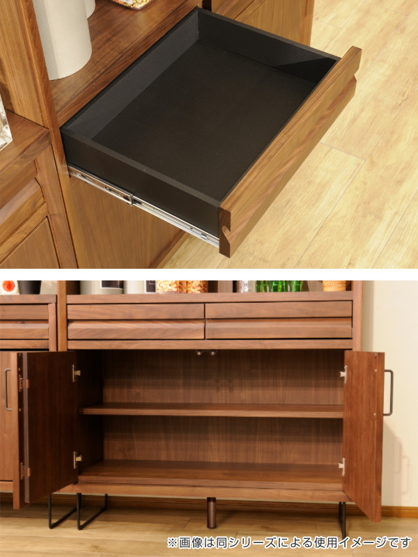 手の届きやすい高さのカウンターキャビネットです。天板の上には、キッチン家電を置いたり、リビングで電話・FAX台として使用したり、様々な用途でお使いいただけます。こだわりのデザインと、高級感のあるウォールナット材は、お部屋をワンランク上の空間にします。