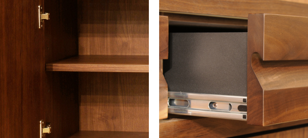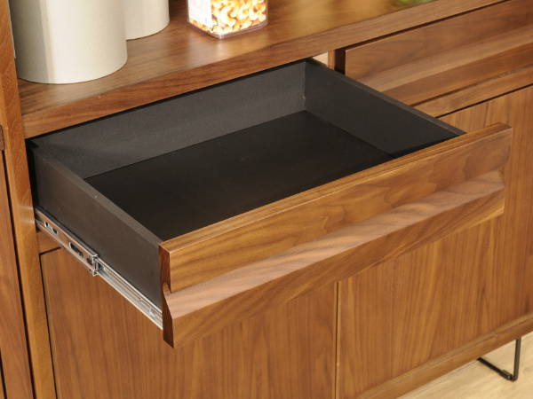 引出しの手掛けは、ウォールナット無垢材を贅沢に使用し、デザイン性と高級感を演出しています。棚板は前面の無垢材を斜めにカットし、シャープな見た目が圧迫感を感じさせないデザインです。熟練の家具職人が手掛ける加工により、使いやすさとデザイン性を兼ね備える一品に仕上がっています。