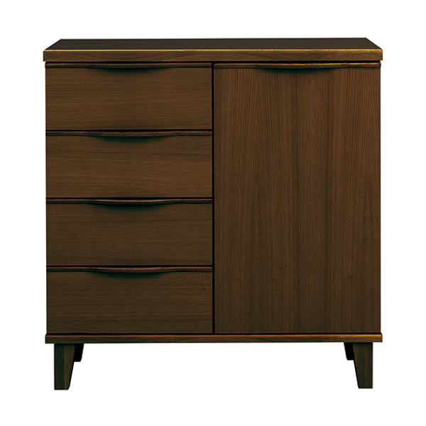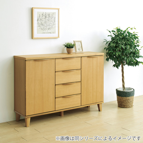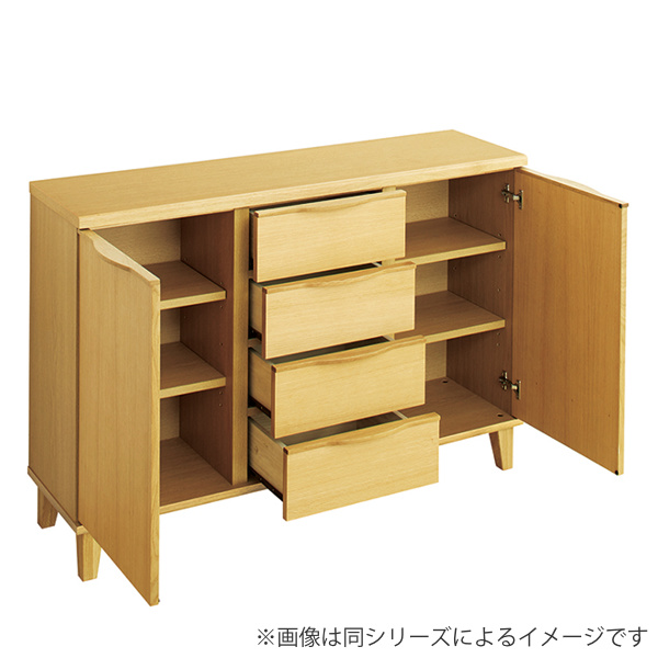 4杯の引出し収納と扉収納が付いた幅約85cmのリビングボードです。FAX台としてや窓下、カウンター下の収納など様々なシーンでお使いいただけます。