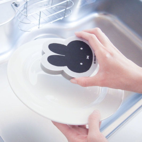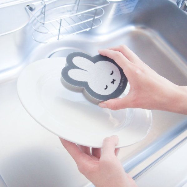 ミッフィー型にカットされたスポンジにお顔のイラストの不織布の食器洗いスポンジです。シンクサイドに置くだけでも気分が上がり、キッチンのインテリアを邪魔しないモノトーンの色使いです。