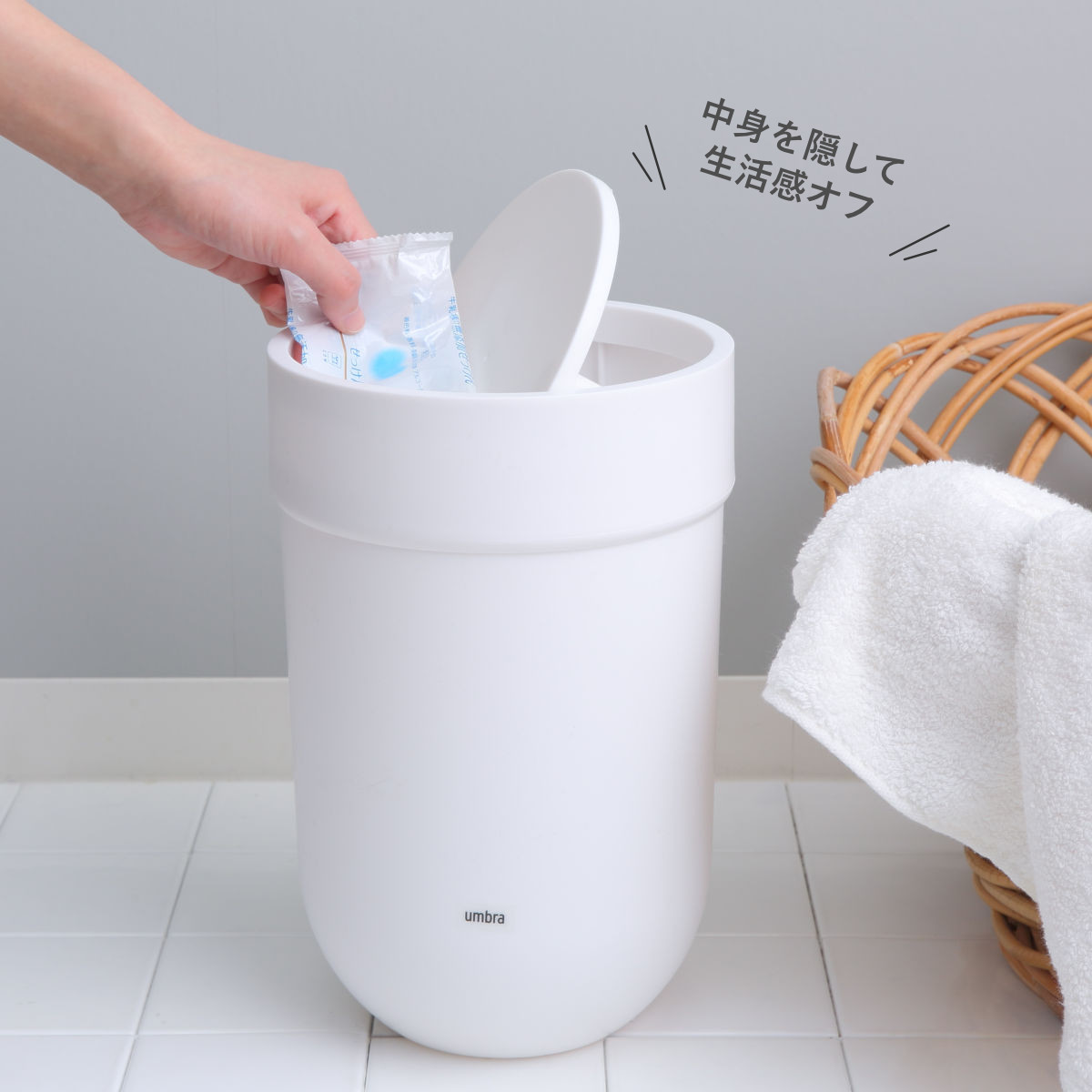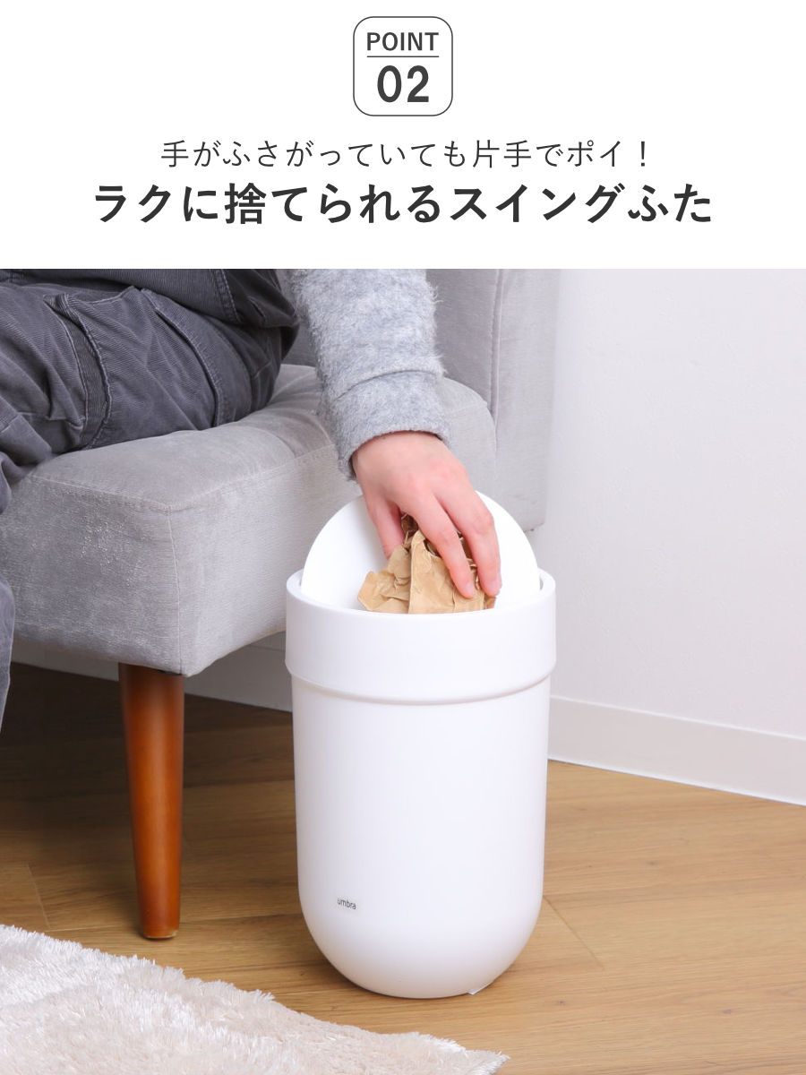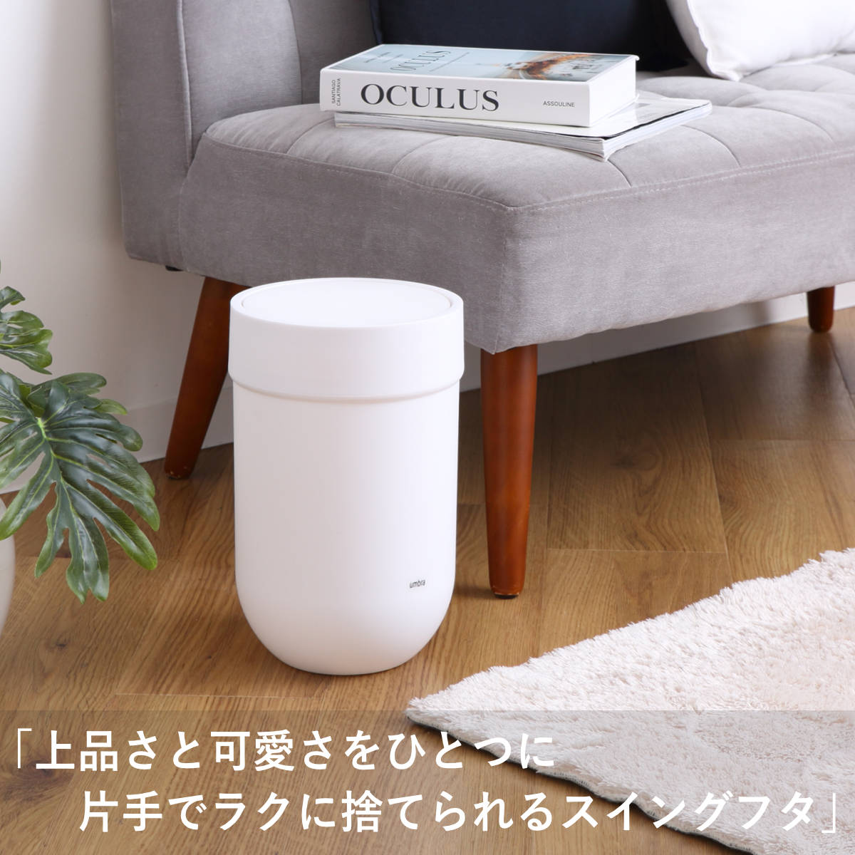 見た目と使いやすさを兼ね備えたダストカン。スイング式のフタで片手でもスムーズにゴミを捨てられます。中身が見えにくい設計で生活感を抑え、すっきりとした印象を保ちます。