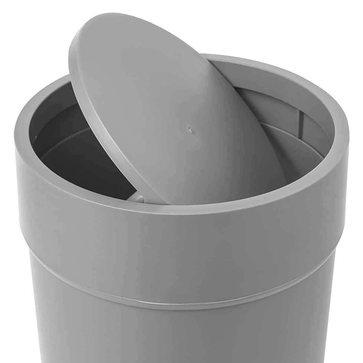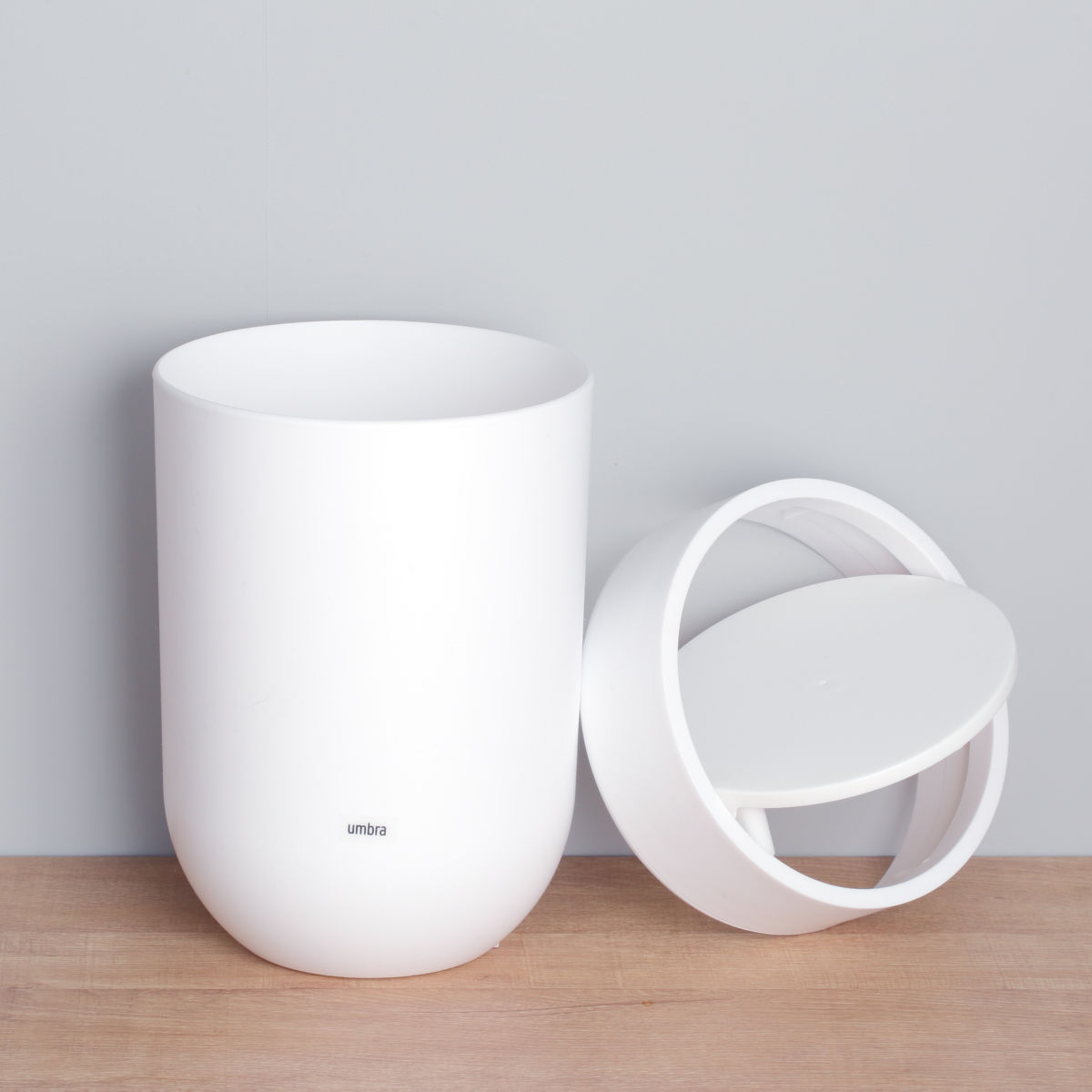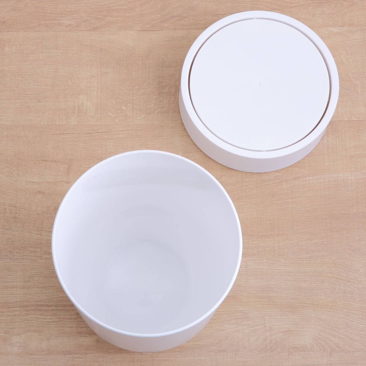 見た目と使いやすさを兼ね備えたダストカン。スイング式のフタで片手でもスムーズにゴミを捨てられます。中身が見えにくい設計で生活感を抑え、すっきりとした印象を保ちます。