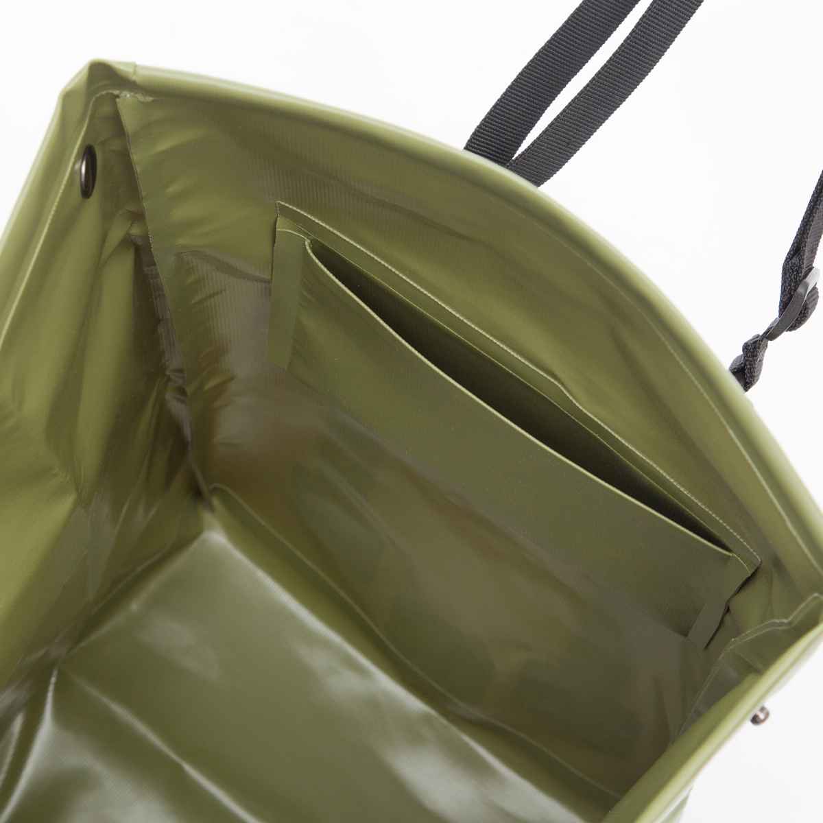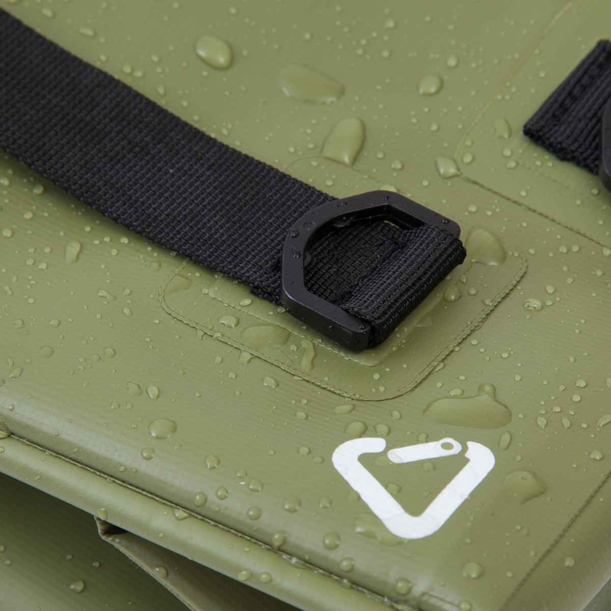 撥水性の高いターポリン生地と、無縫製の熱圧着仕上げを採用。雨に強く、中身が濡れにくいので、天気を気にせず使えます。汚れてもサッと水洗いできる扱いやすさも魅力です。