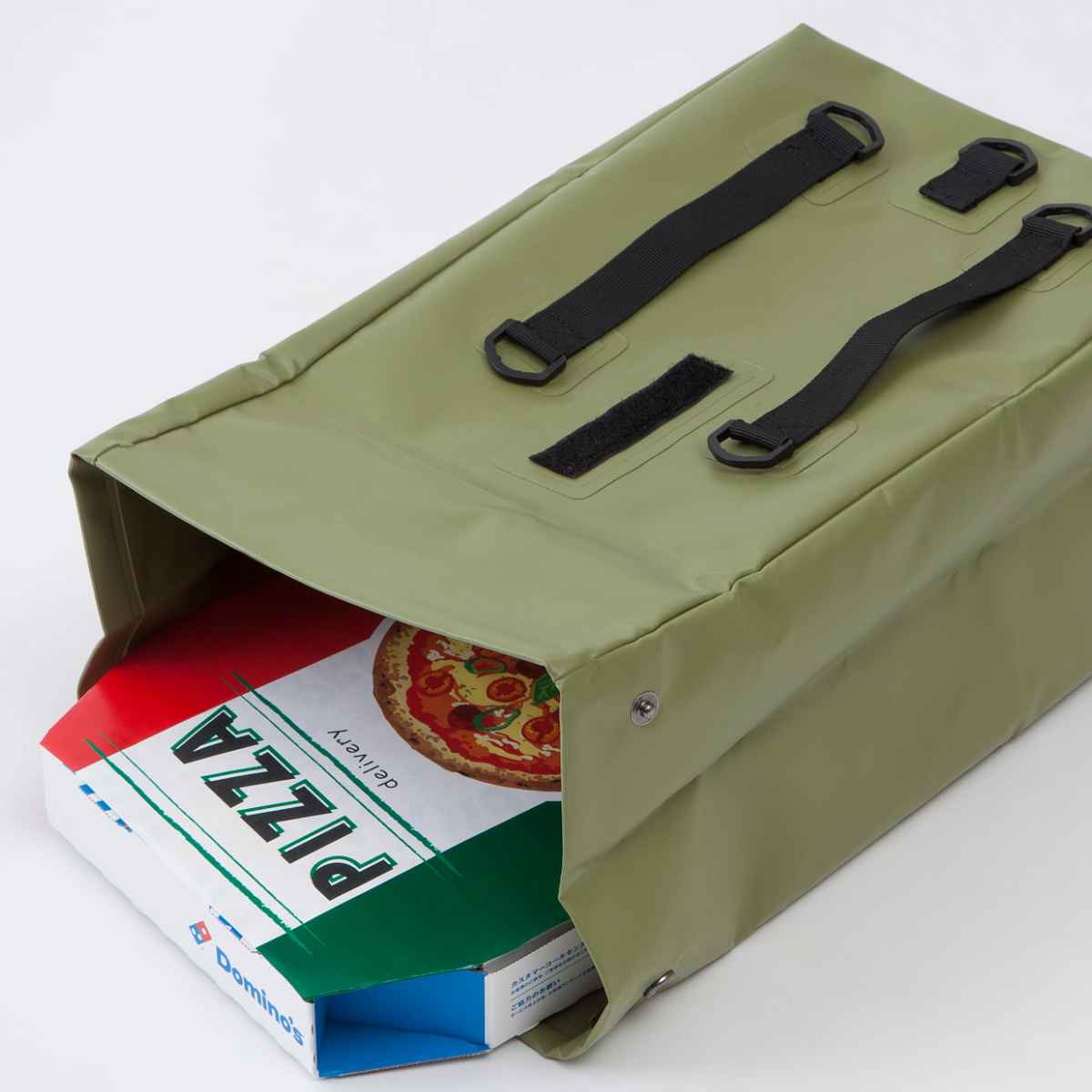 ピザのMサイズが入るほどの大容量で、傾けずにピザやお寿司をそのまま持ち運べる設計です。型崩れしやすい食品も安心して運べるため、テイクアウトや差し入れにも便利です。