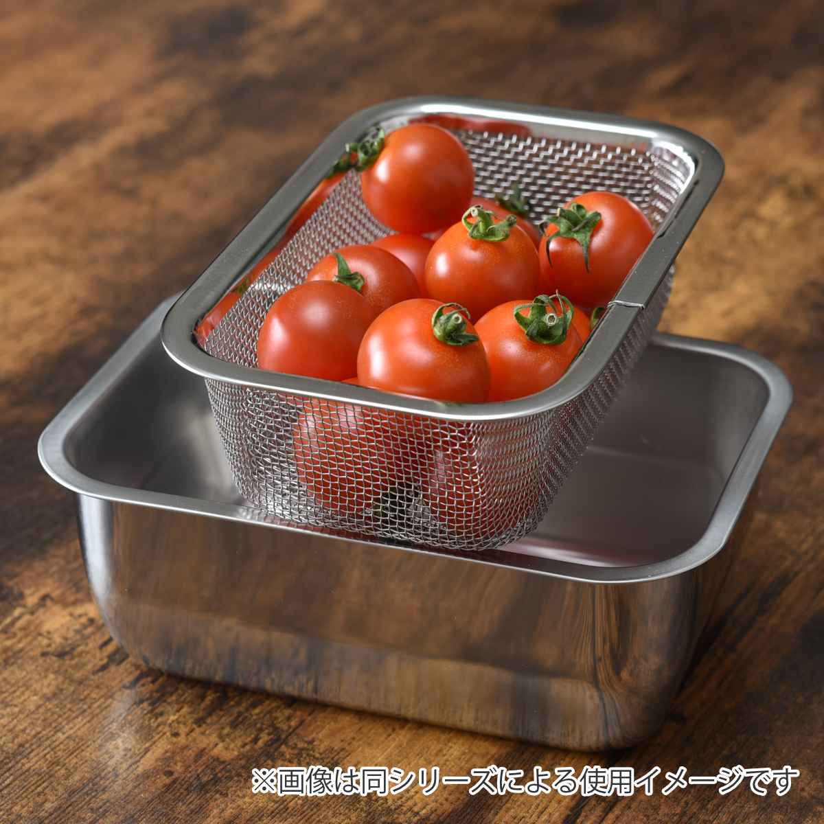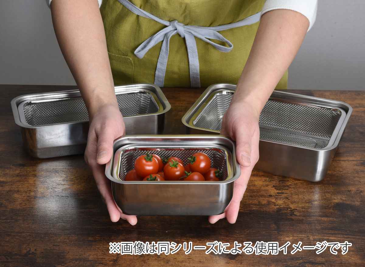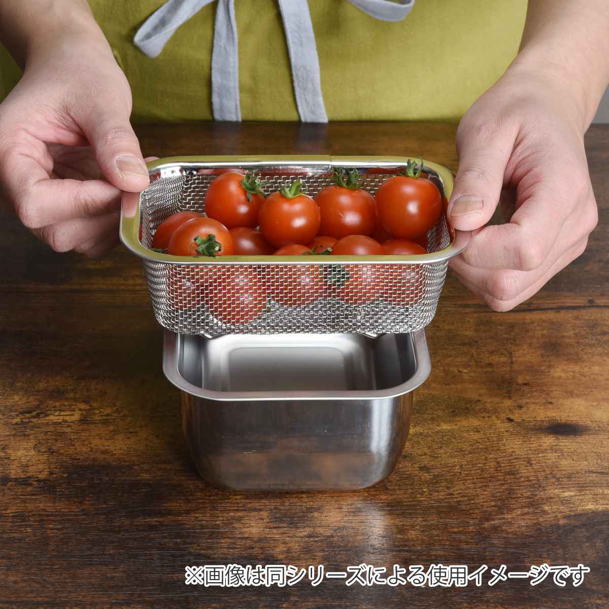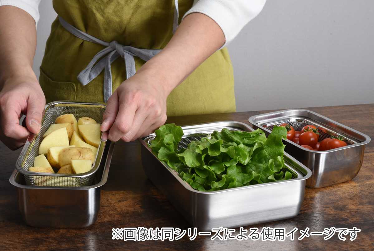 角ザルは、別売りの角バットにすっぽりと収まるジャストサイズです。角バットに入れたまま蓋をすることができるので、野菜を洗った後に水切りをし、そのまま蓋をして保存することができます。