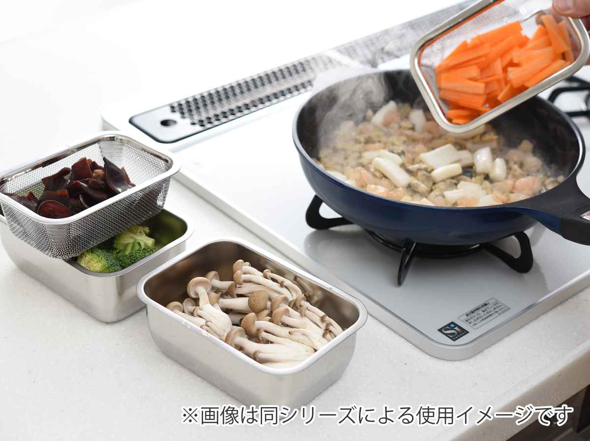 四角いカタチにすることでデッドスペースを減らし、重ねて置くこともできるので、丸型のザルやボウルを広げることなく調理スペースを有効活用できます。スペースの限られたキッチンを広く使え、作業効率もアップします。