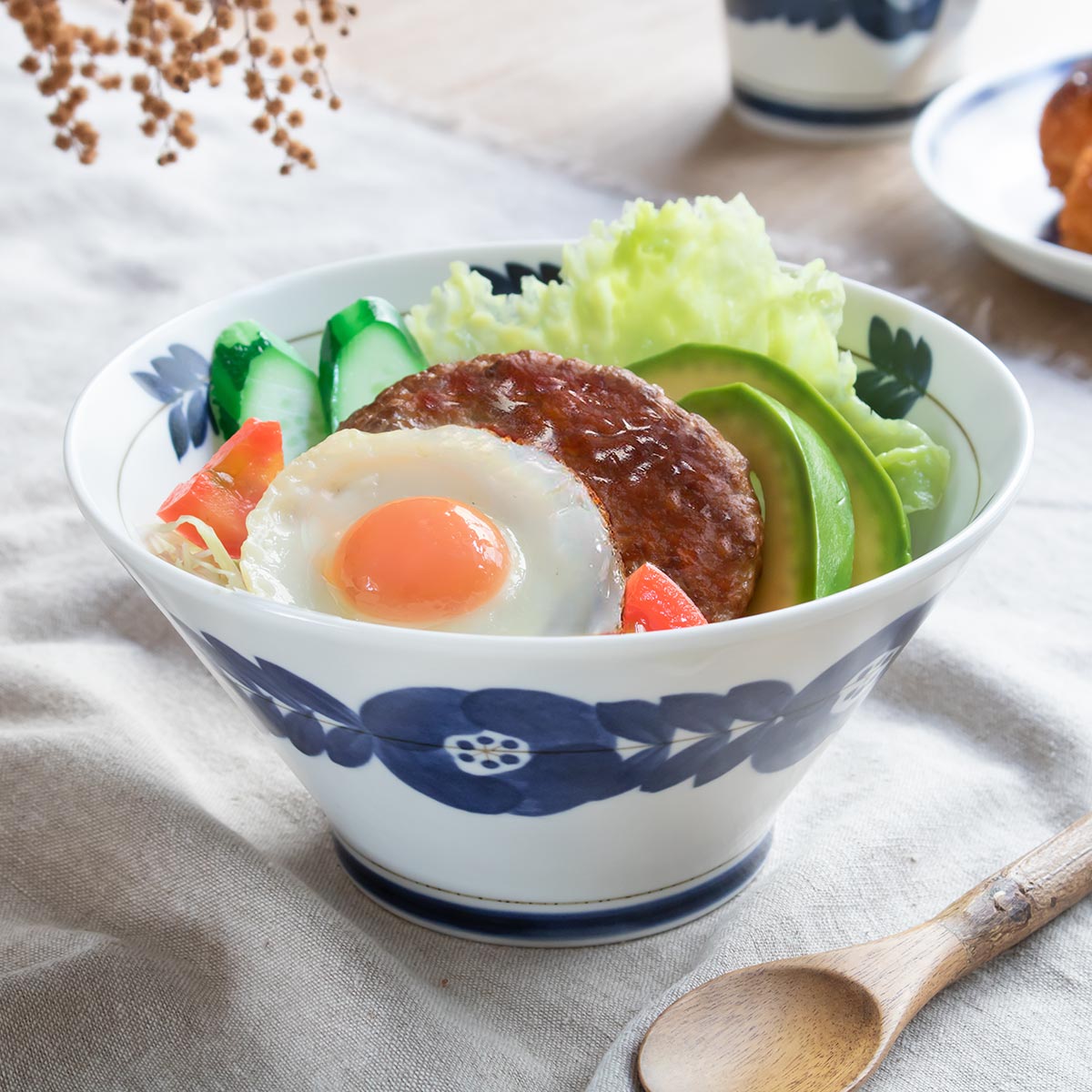 ロコモコ丼や親子丼にちょうど良いサイズのボウルです。取り分け用のサラダボウルや、ラーメンや蕎麦などを入れて麺鉢としてもお使いいただけます。洋風だけでなく和風のお料理にも合うデザインです。カジュアルにも上品にも使えるので普段使いはもちろん、おもてなしにもぴったりです。
