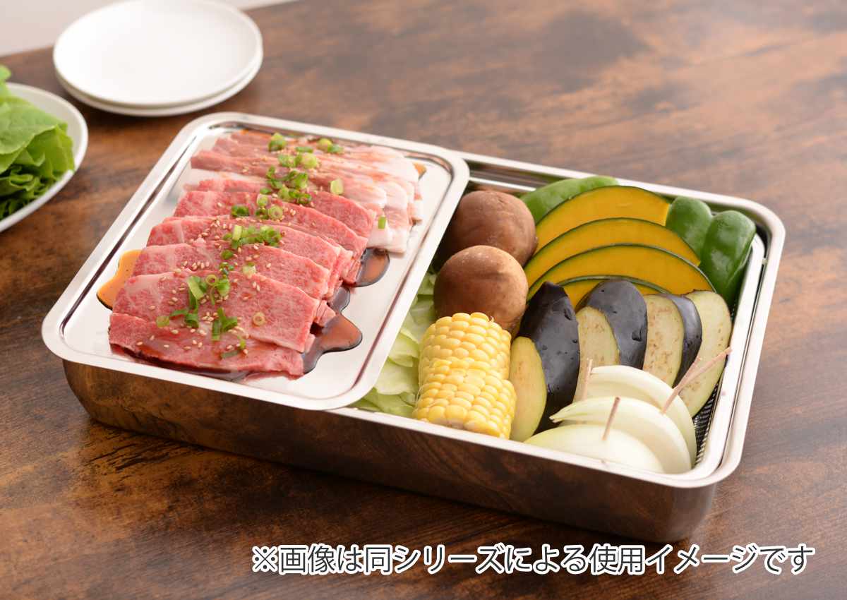 サビにくく耐久性に優れた18-8ステンレスのトレーです。浅い形状なので、食材が取り出しやすく、調理の下ごしらえに活躍します。