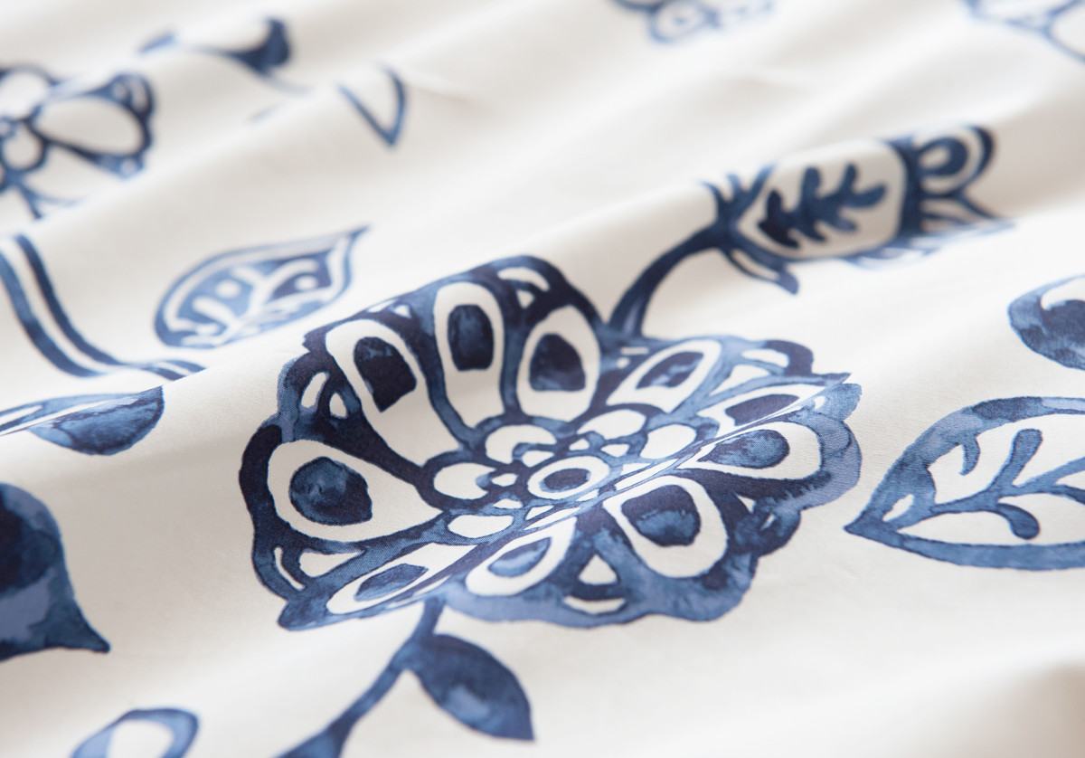 天然繊維コットン100%の糸を使用した200本ブロード(1インチ間に200本の糸を使って織った平織り生地)にプリントしています。なめらかな中に張りのある独特の触り心地が魅力です。光沢があり織り目が密なので丈夫さも兼ね備えています。