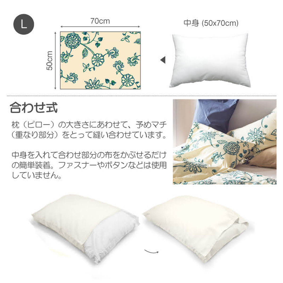 枕の大きさに合わせて、予めマチをとって縫い合わせています。中身を入れて合わせ部分の布をかぶせるだけの簡単装着です。ファスナーやボタンなどは使用していません。