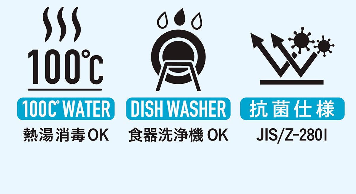 100度までの耐熱なので、熱湯消毒、食洗機の使用が可能です。また抗菌加工が施されているので衛生的に使えます。