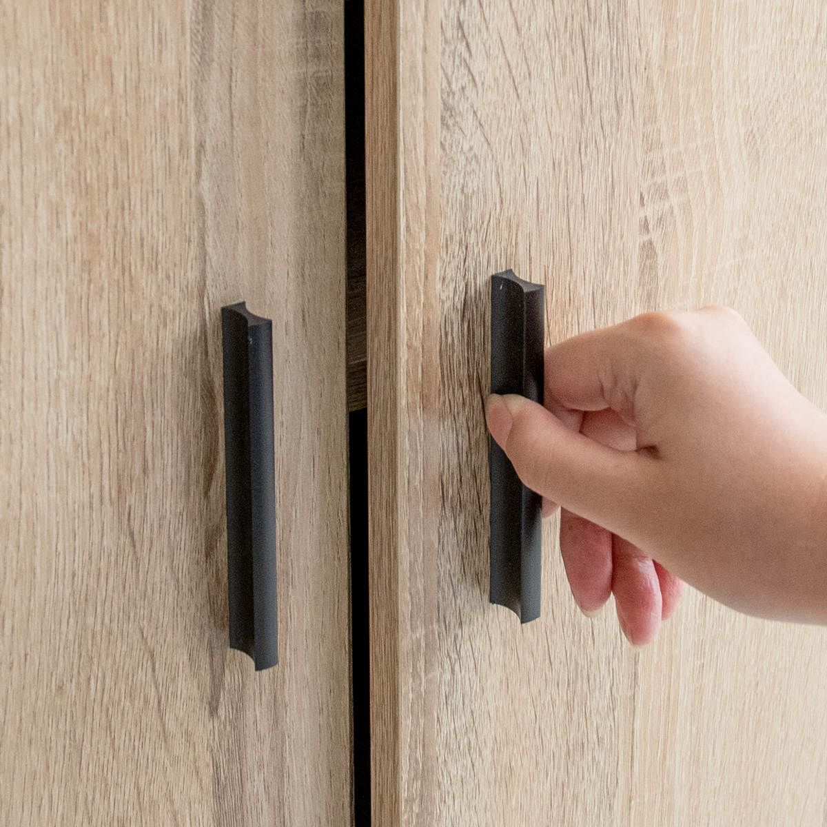 | 両開きで使いやすい ホコリの侵入を防ぐ扉は、使いやすい両開きです。取っ手は掴みやすい形状で開閉が楽にできます。 | 丈夫でスムーズな開閉 開閉部分にはガタツキにくく丈夫なスライド蝶番を採用しています。 |