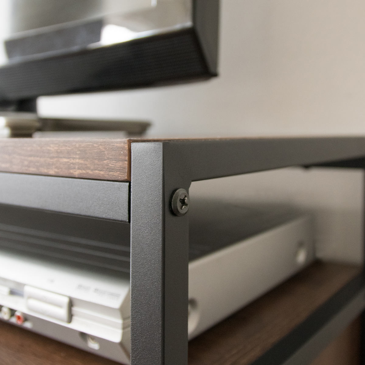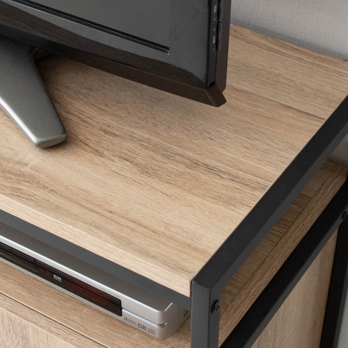 天板下にはAV機器を設置するのに最適なオープンスペースがあります。DVDの出し入れや、リモコン操作もスムーズです。背板や側板がないので、機器の熱がこもらず安心です。