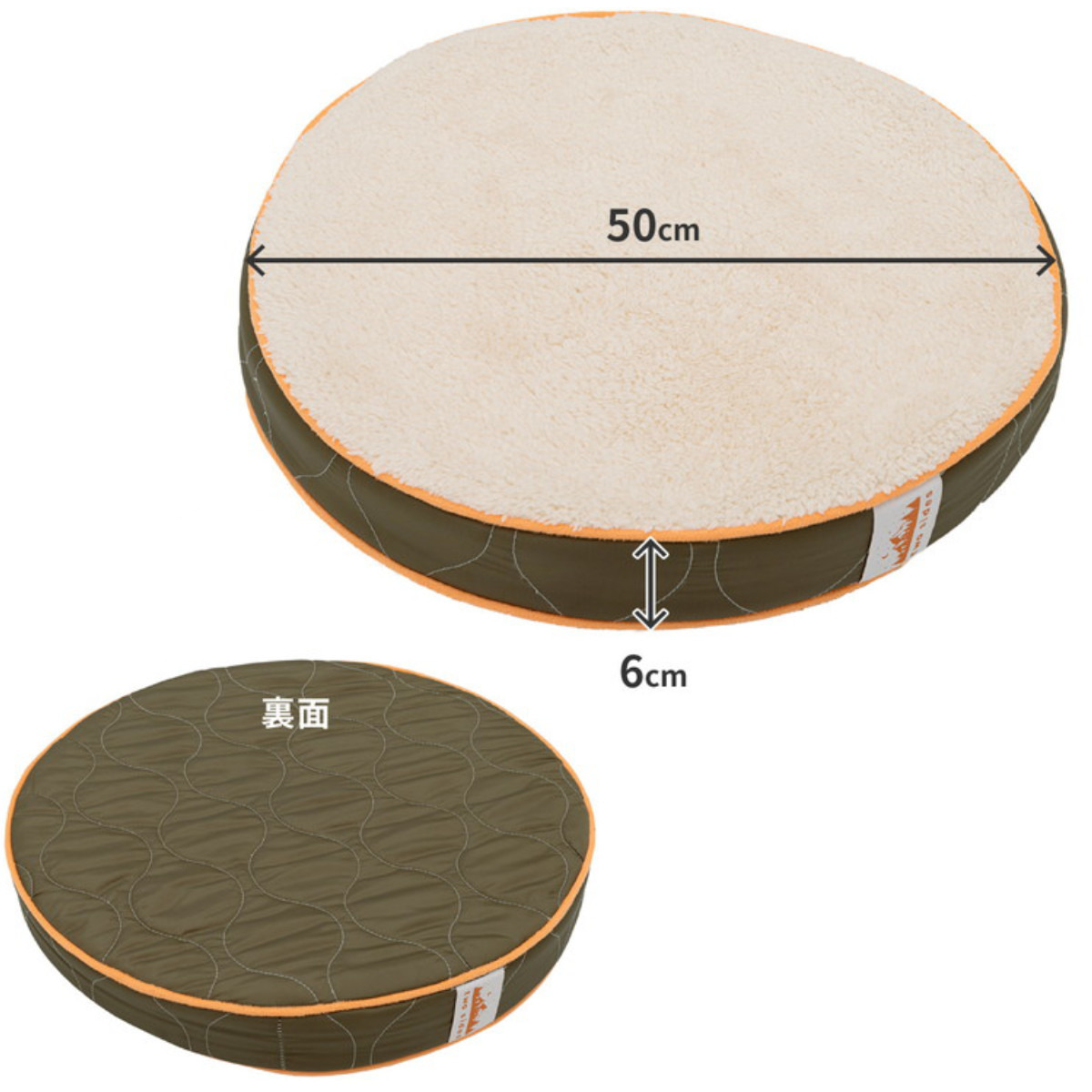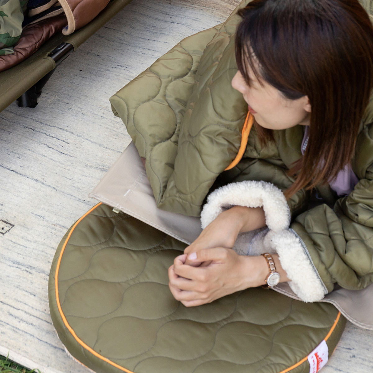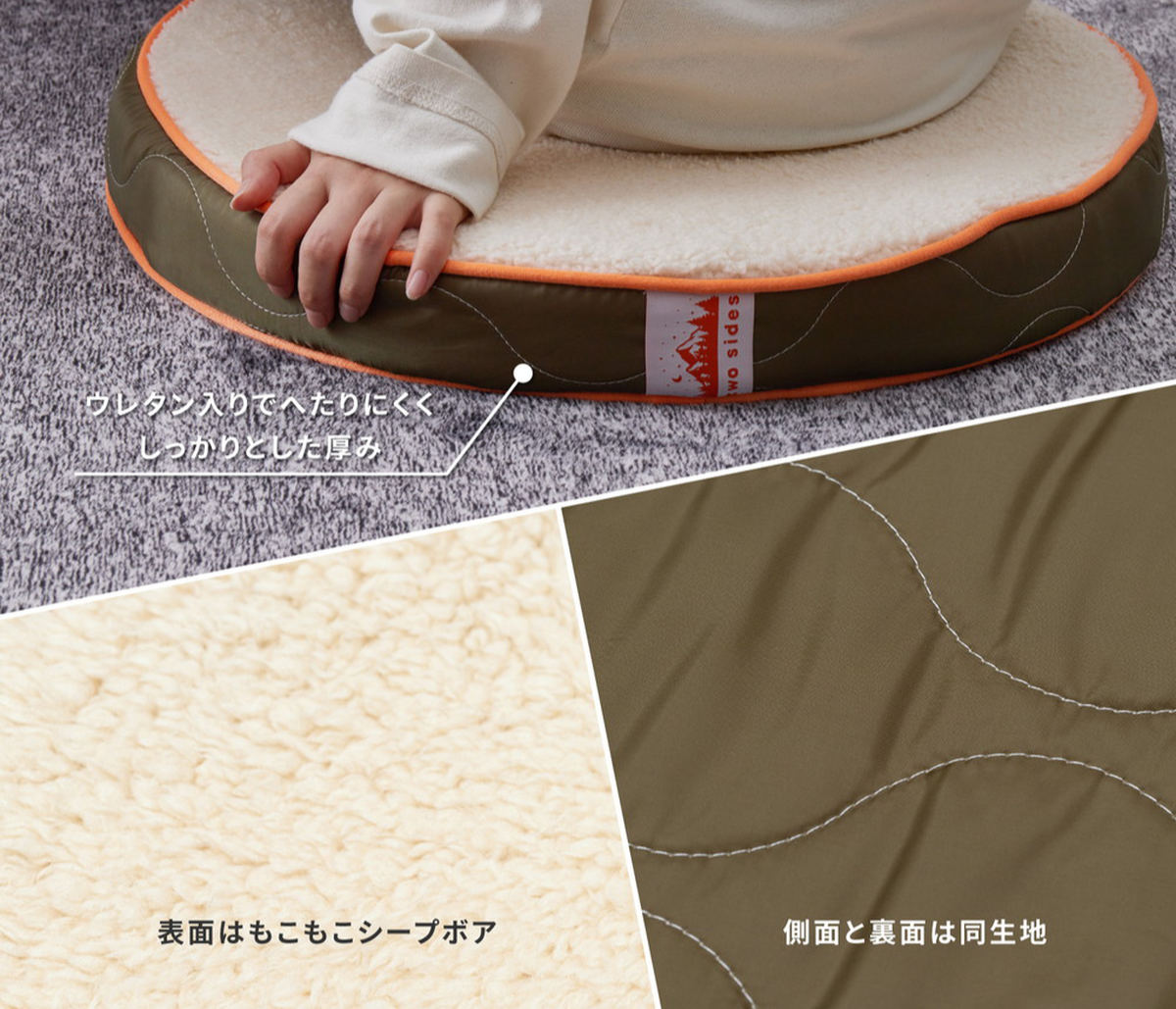 生地は、耐候性に優れているポリエステル素材を使用しています。表面は、ゴミが付きにくい毛足がない仕様、裏面はもこもこのシープボアを組み合わせてあるので、おうちでのご使用はもちろん、キャンプやアウトドアのお供にぴったりです。