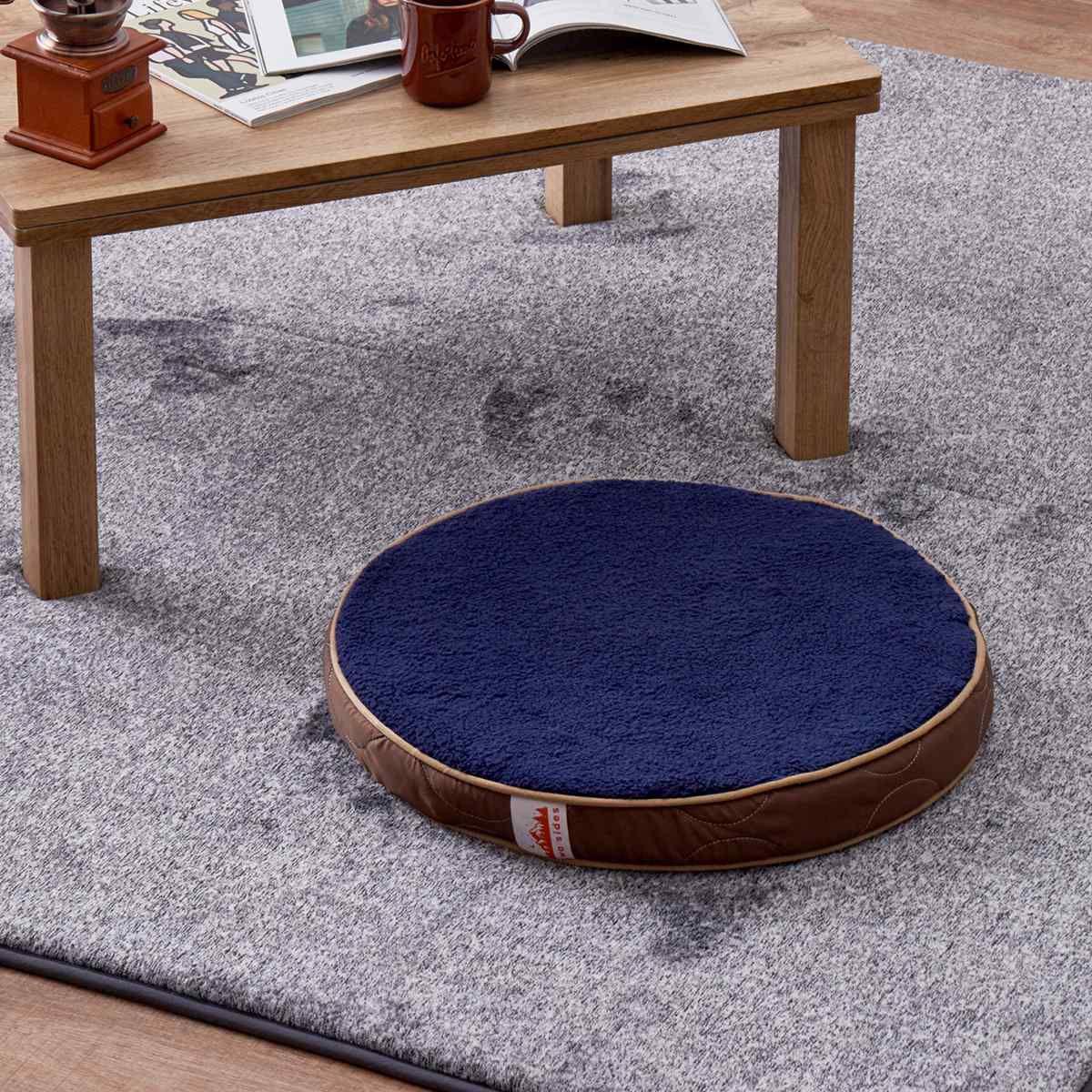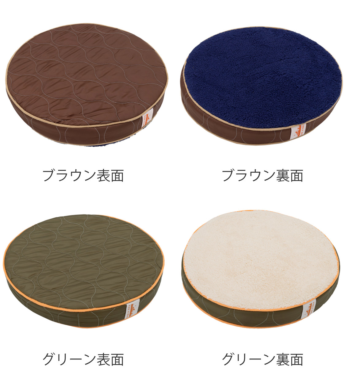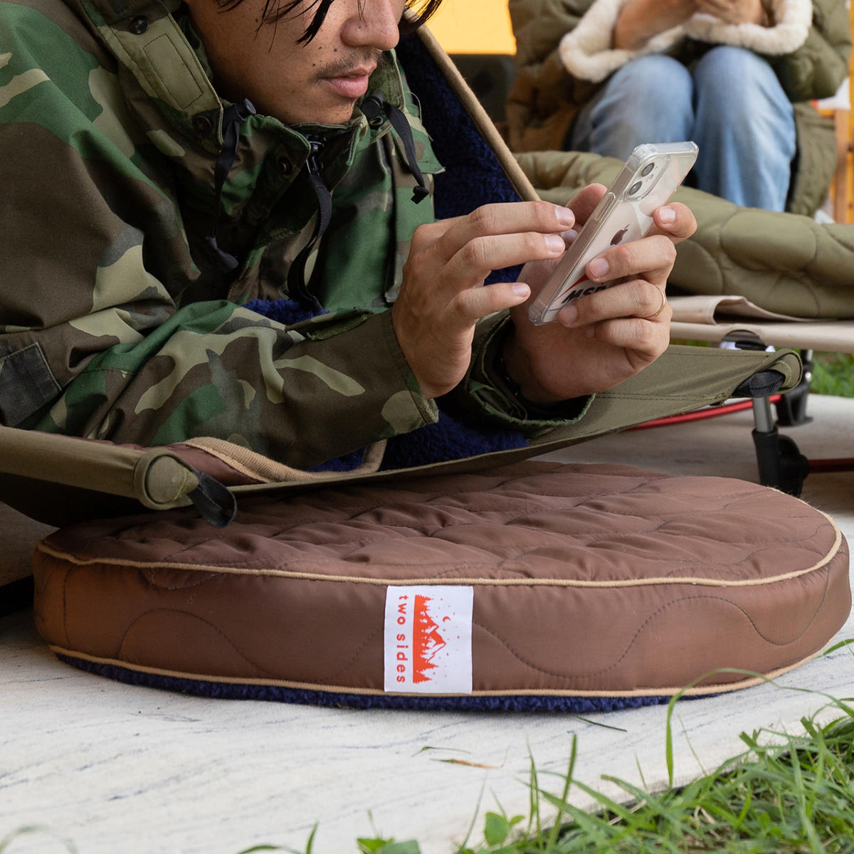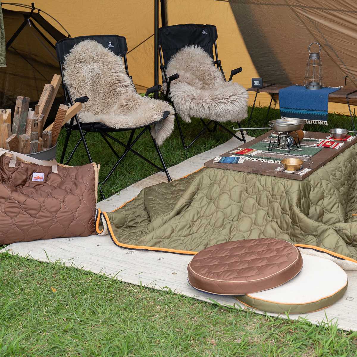 生地は、耐候性に優れているポリエステル素材を使用しています。表面は、ゴミが付きにくい毛足がない仕様、裏面はもこもこのシープボアを組み合わせてあるので、おうちでのご使用はもちろん、キャンプやアウトドアのお供にぴったりです。