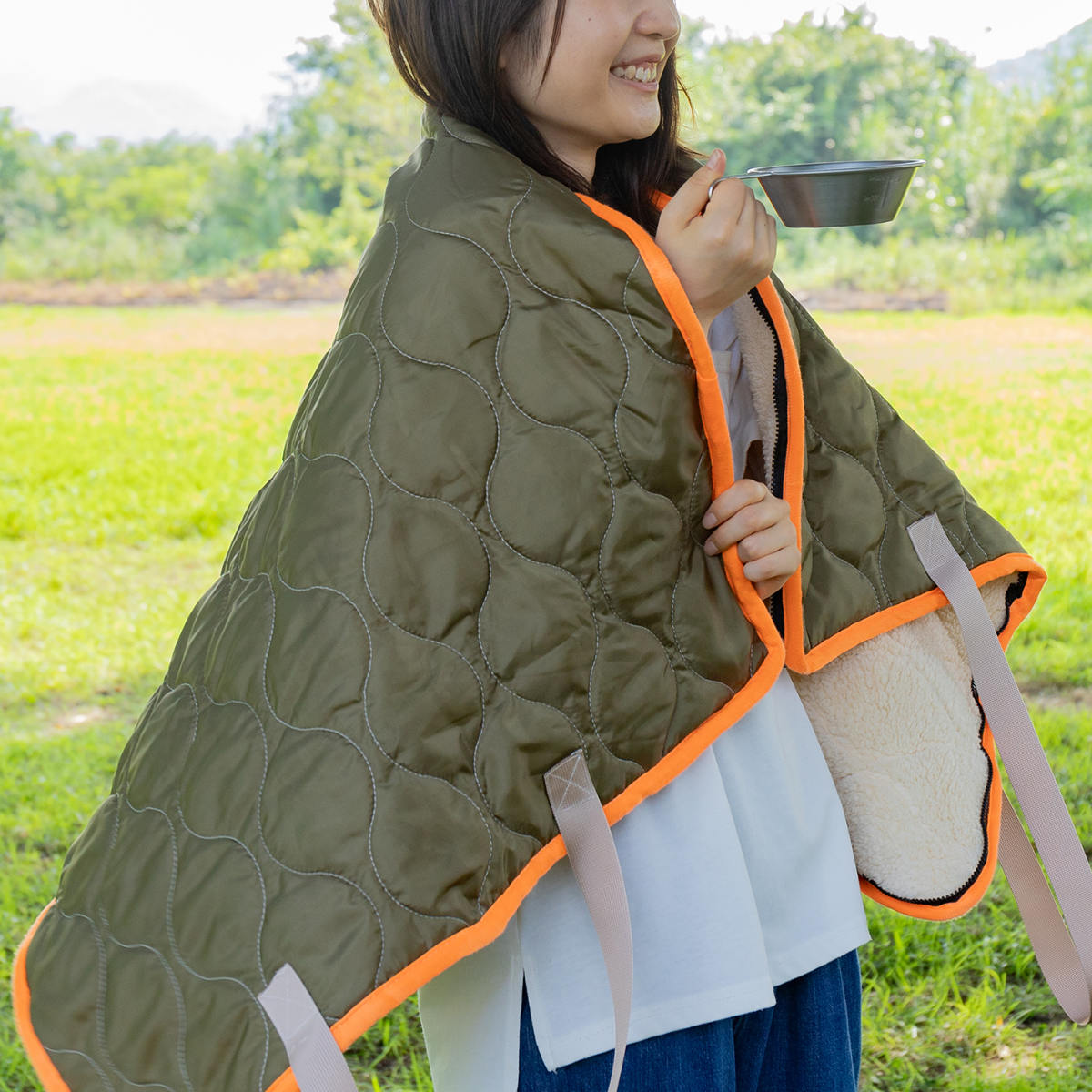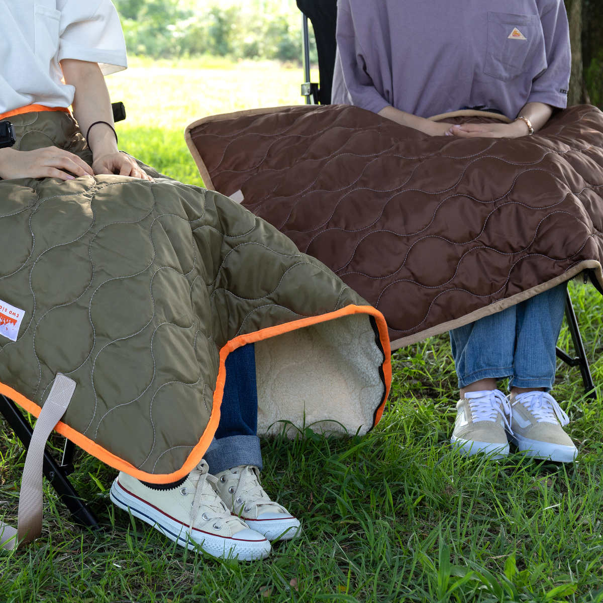 表面のポリエステル生地は土や落ち葉がついても、はたけば汚れが落ちやすく、裏面は肌触りの良い保温力たっぷりのシープボア生地ですので、アウトドアシーンでのブランケットにぴったり。また、しっかり羽織る事ができる大判サイズです。