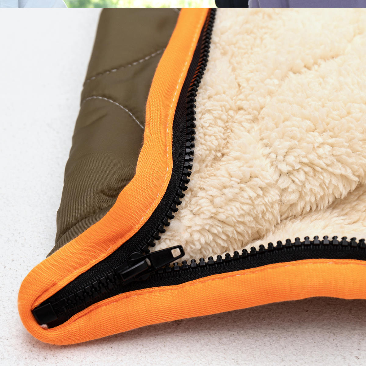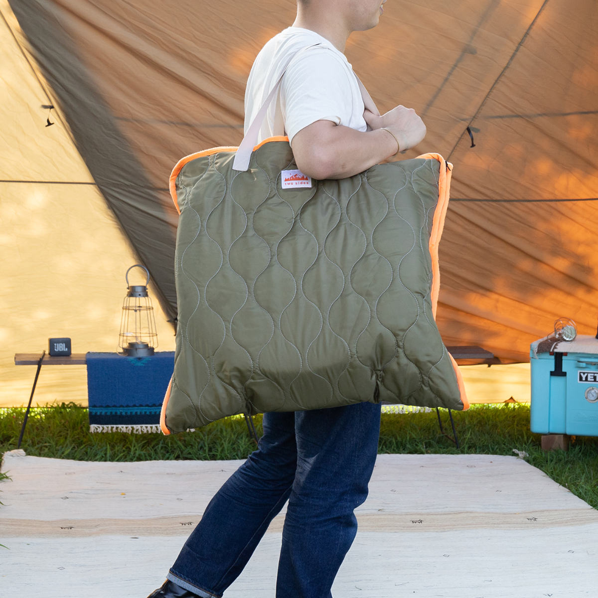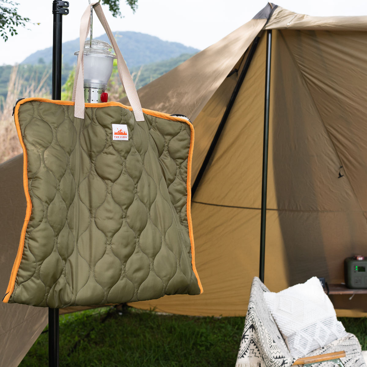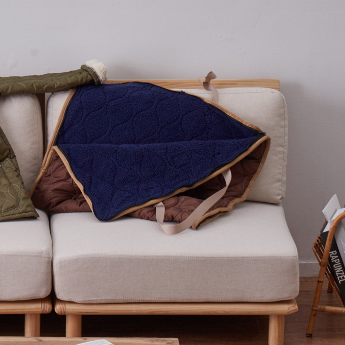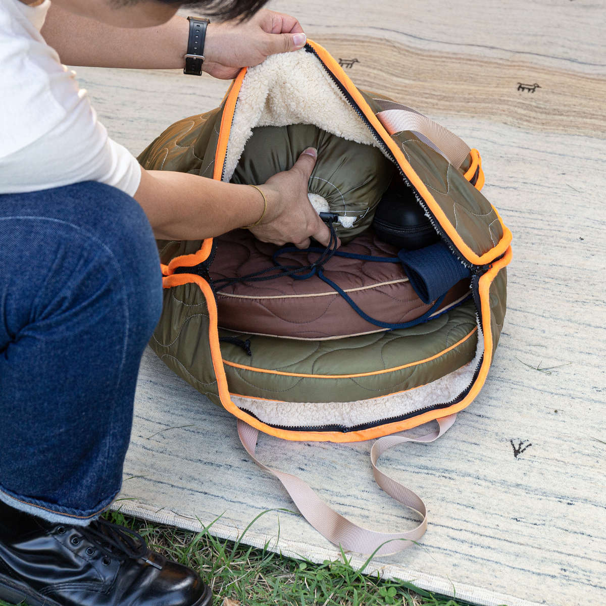ミリタリー風の生地と暖かみのあるシープボアを組み合わせたアウトドアにぴったりの大容量バッグです。たっぷり収納できるトートバッグから、ファスナーを開くとブランケットに早変わり。お家ではもちろん、外出先でも活躍する便利アイテムです。