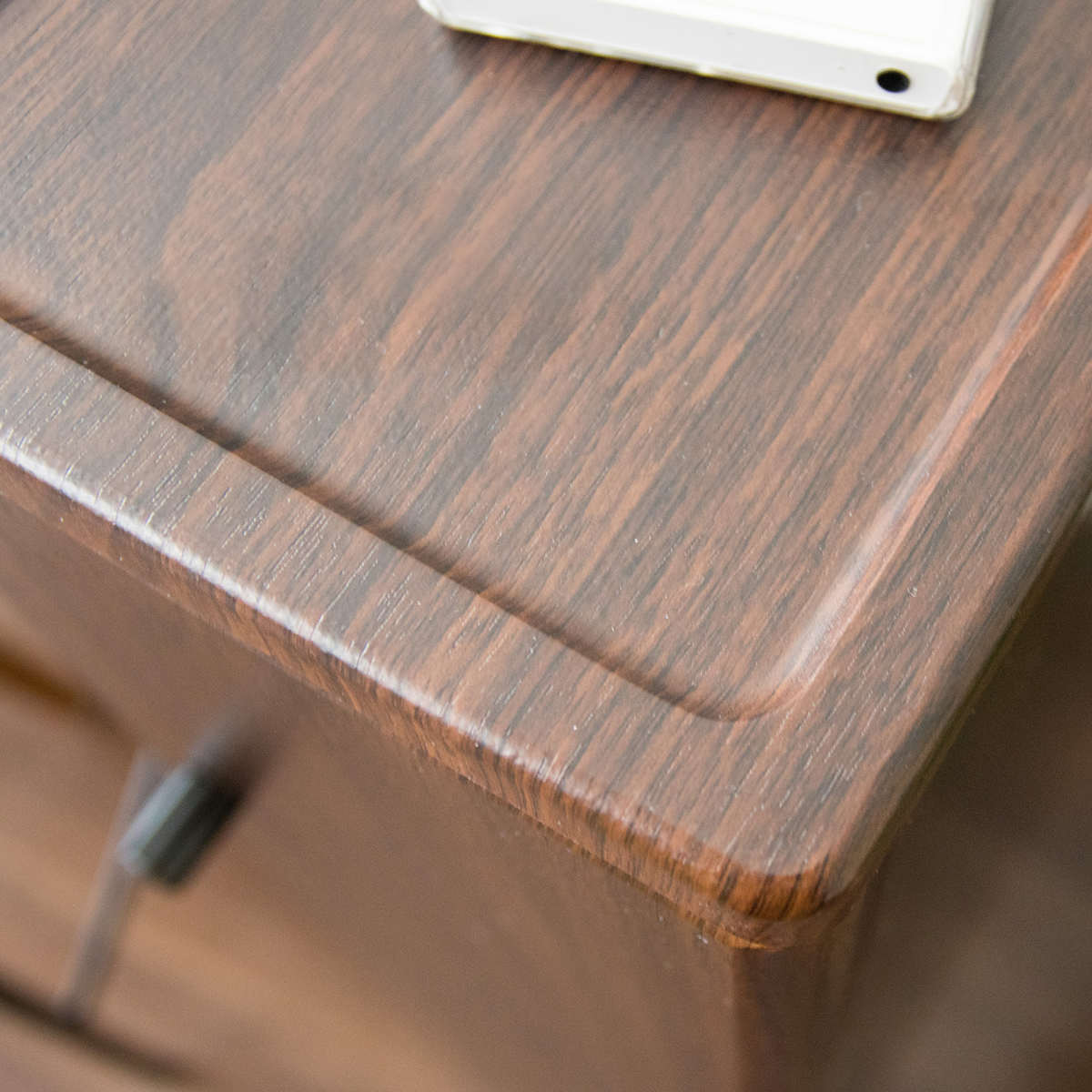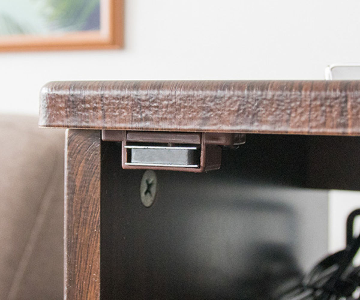 天板には2口コンセントがありタブレットやスマートフォンの充電にも便利です。天板のフチには段差を付けており、ペンなどを置いたときの転がり落ちを防止します。また、角を丸く加工しているため安心安全です。