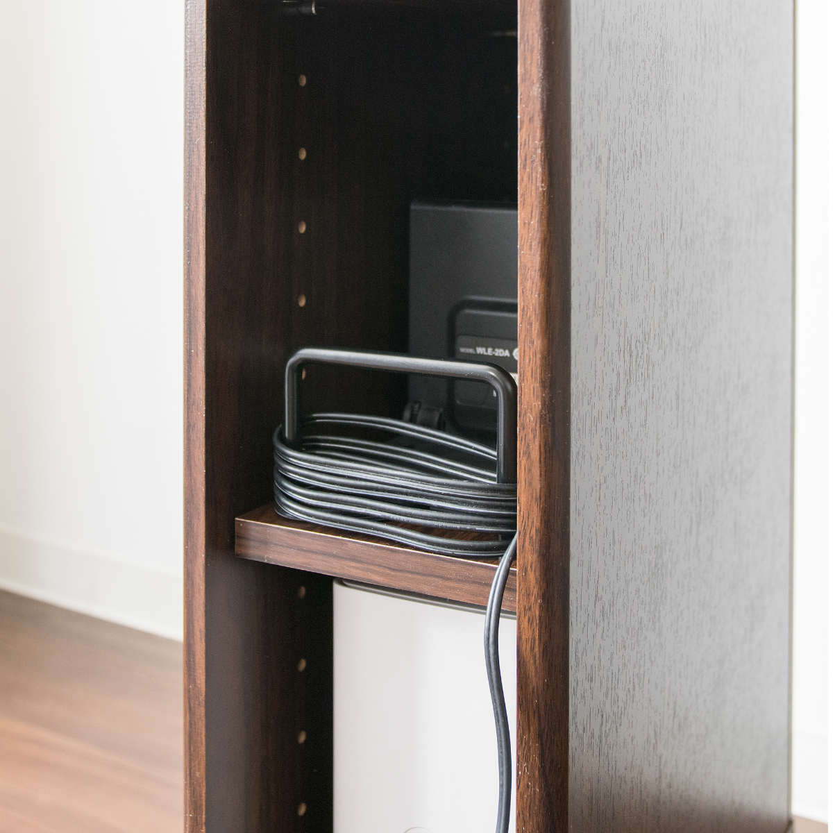 扉内には可動棚が2枚付属しており、収納するものの高さに合わせて棚位置を変えていただけます。また、棚板の奥にはコード巻取りフレームが付いているので、長いコードも綺麗にまとめることができます。