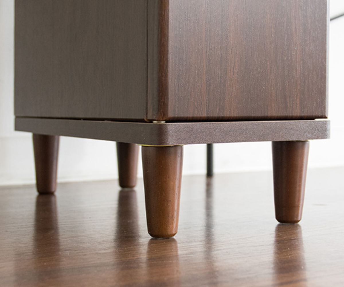| 水や傷に強い素材 木板は水や傷に強いPVC素材に安定性の高い化粧繊維板を合わせた素材で、汚れても簡単に手入れできます。 | 傷防止の樹脂パッド付き 脚部は天然木を使用しています。高さ7cmで掃除機も通ります。脚裏には床の傷つきを防止する樹脂パッド付きです。 |