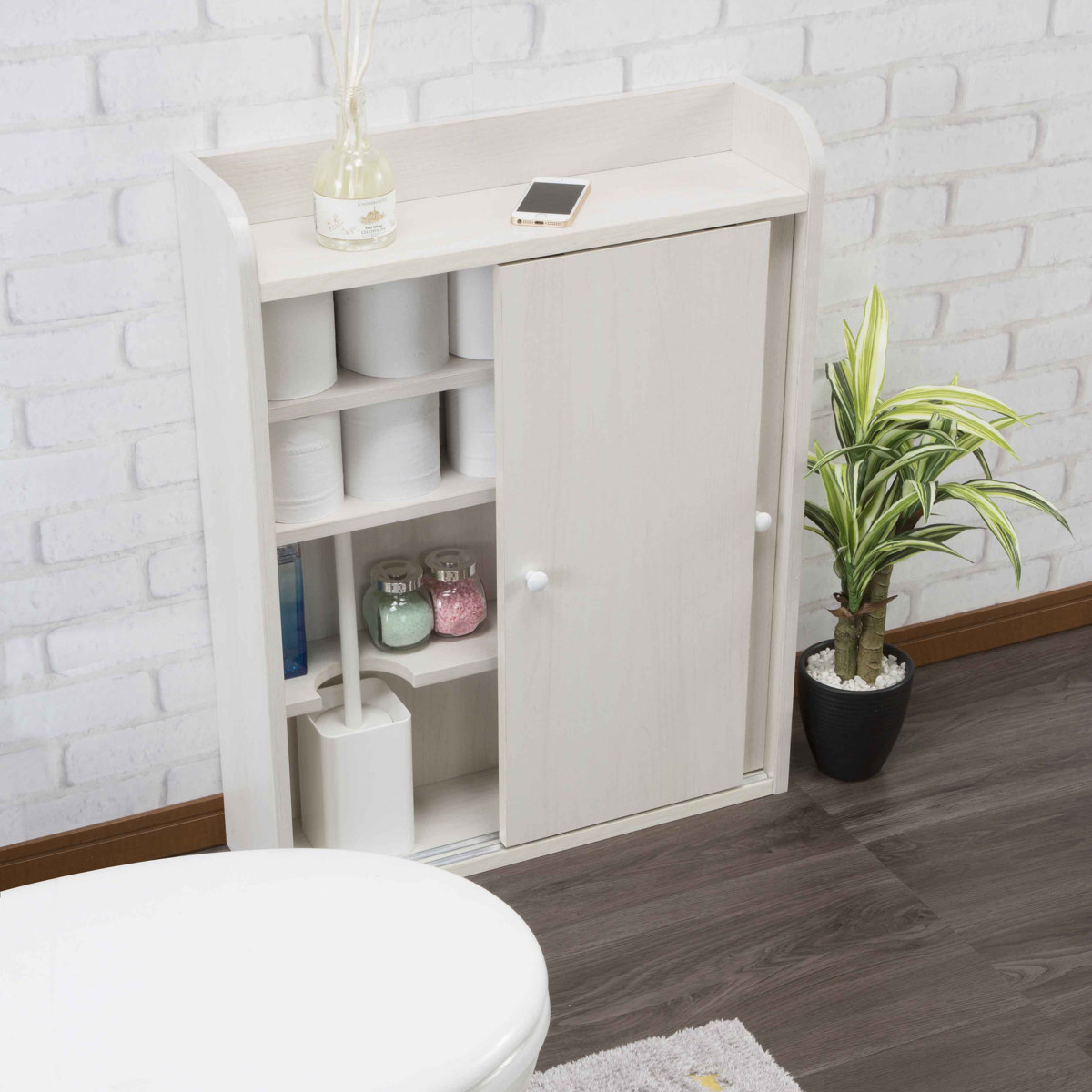 トイレラック 奥行17cm 薄型 ( スリム トイレ 収納 掃除用具入れ トイレ収納ラック 省スペース トイレットペーパー 洗剤 サニタリー 除菌シート ブラシ 引き戸式 飾り棚付き おしゃれ )