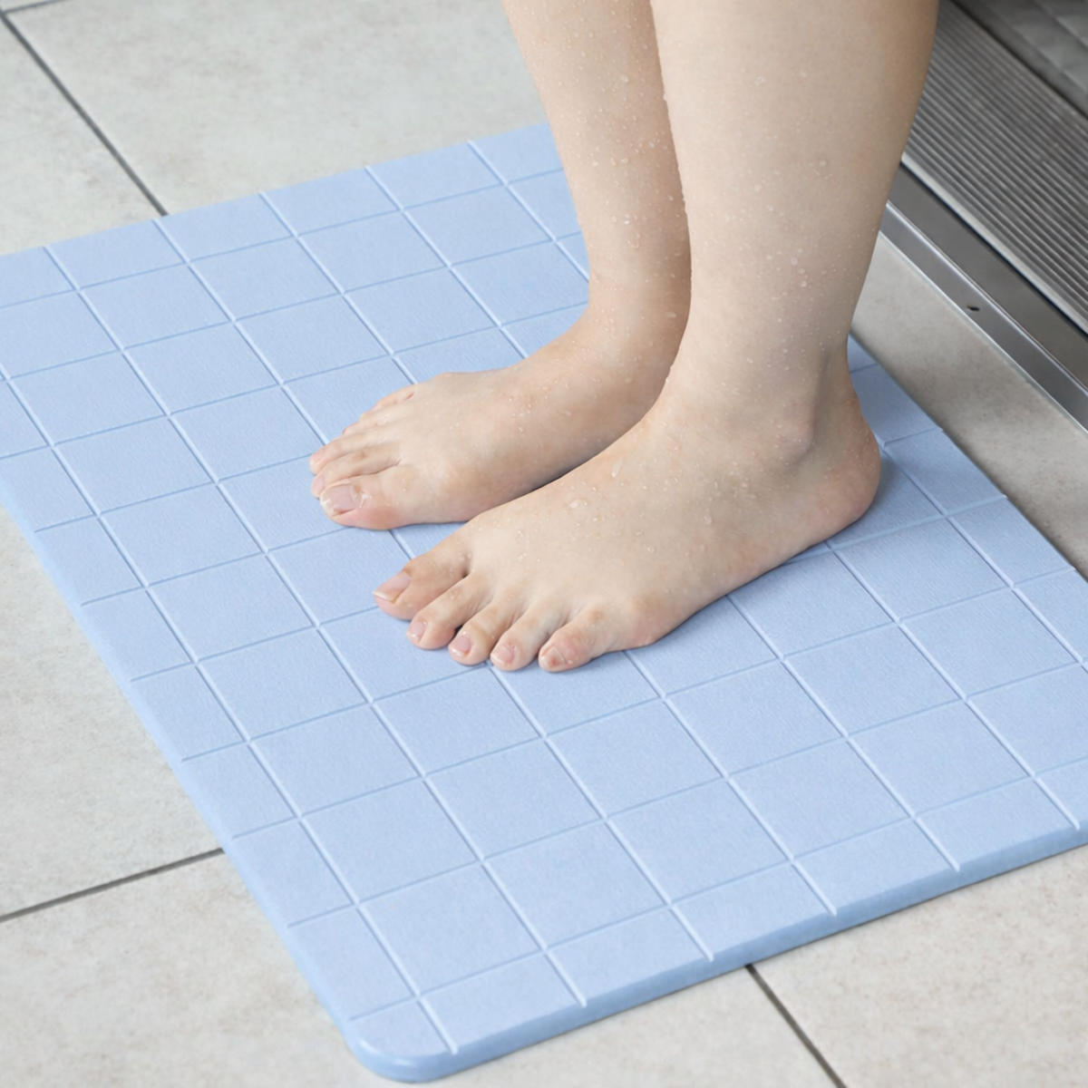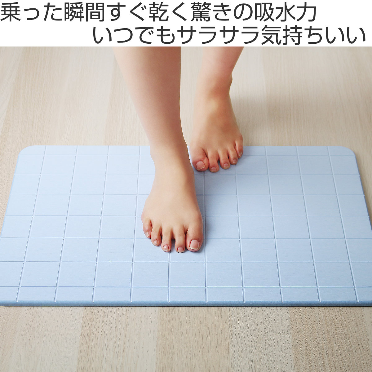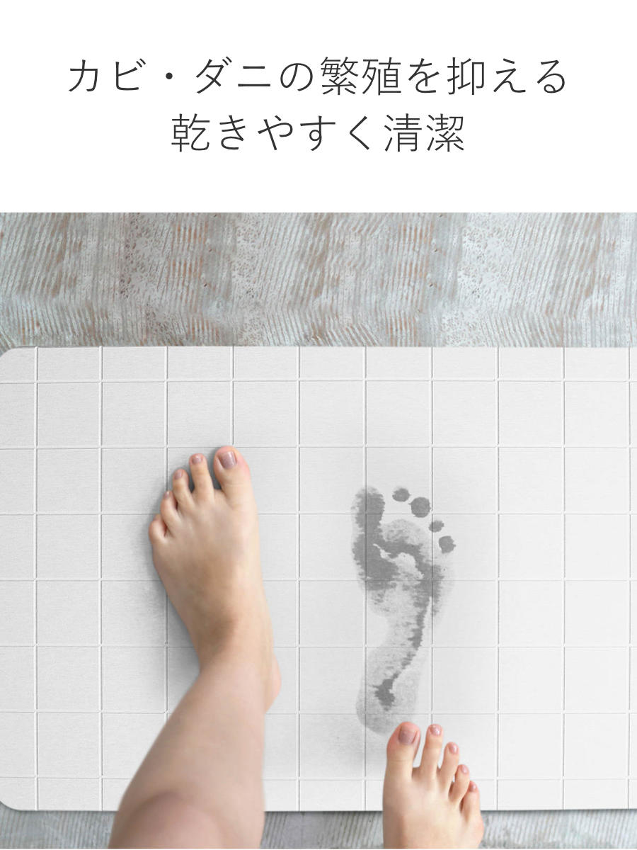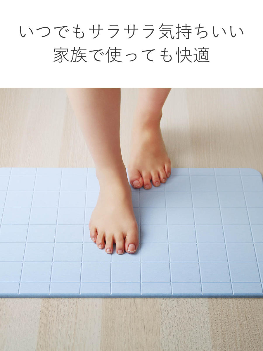 吸収した水分が一定量に達すると自立呼吸により水分を放出するので、表面はいつもサラサラな状態を保つことが出来ます。お風呂が2人目、3人目になってもマットがびしょ濡れにならず快適です。