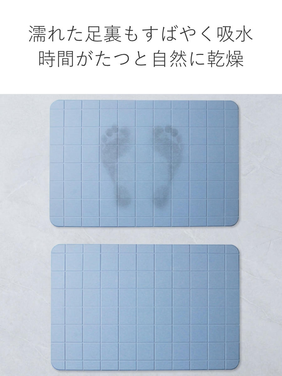 吸水性の高い自然素材、珪藻土でつくられたバスマットです。湯上がりの濡れた脚の裏の水分をすばやく吸い取り、時間がたつと自然に乾燥します。マットを踏んだ瞬間から珪藻土が気持ちよく水分を吸い取ってくれる間隔を味わえます。