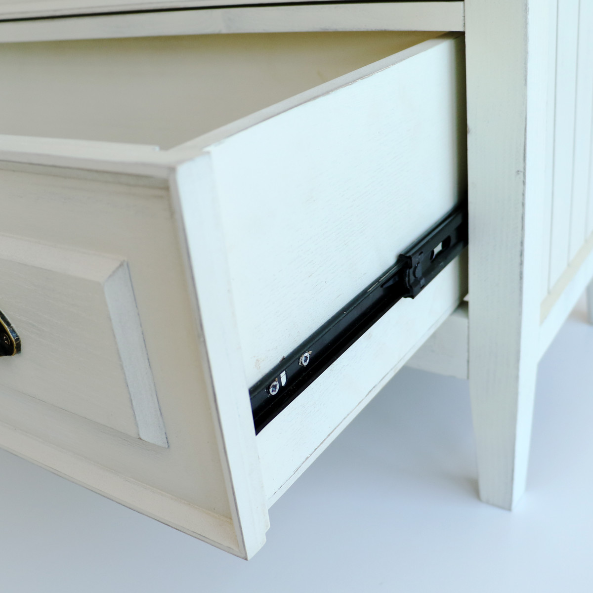 天板の小口や引出しの前板、側板などに装飾を取り入れています。取っ手の金具など細部にまでこだわったアンティーク調のデザインです。