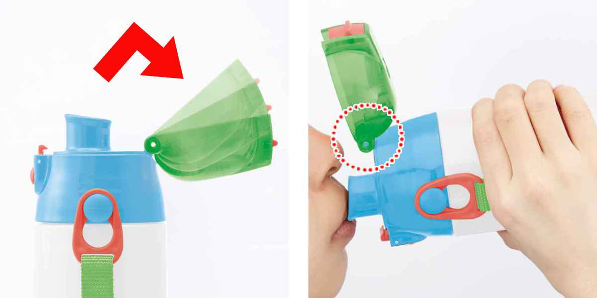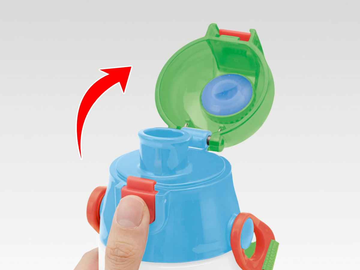 水筒の蓋はボタンを押すだけで開けることができるワンタッチ式です。飲み終わったら蓋をカチッと閉めるだけなので、小さなお子様でも簡単に開閉できます。