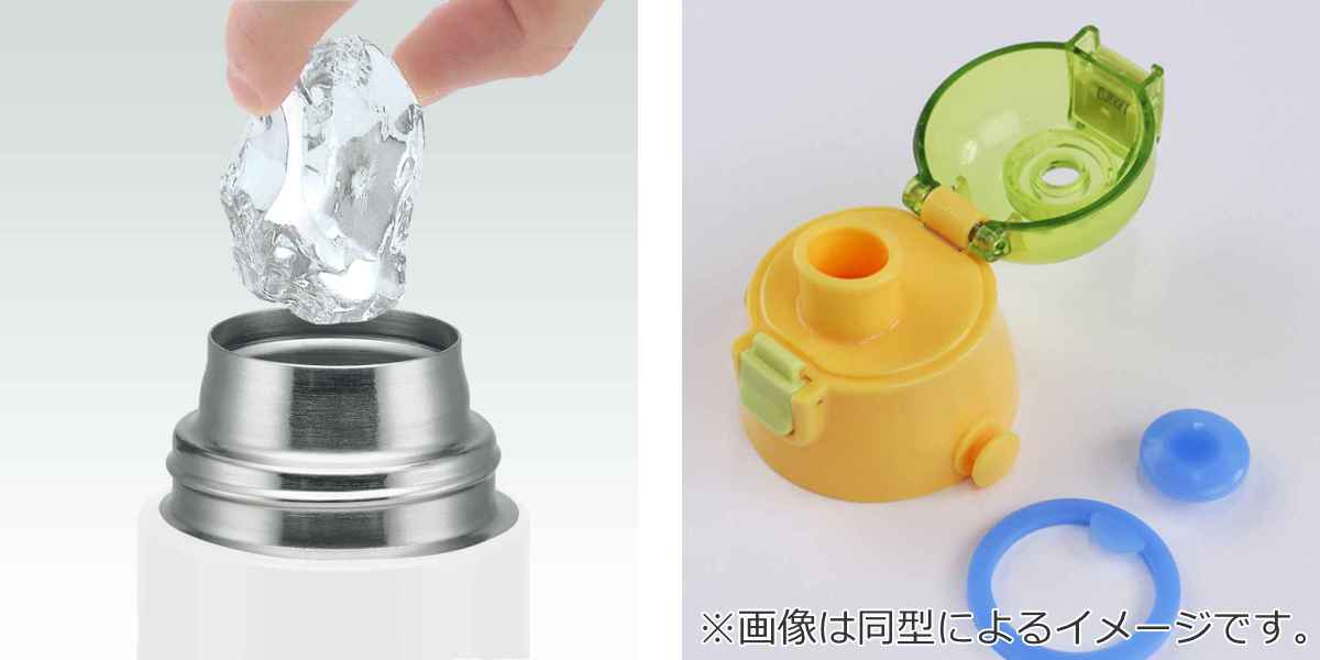 口径が広いので大きな氷も入れやすく、しっかり洗えて清潔に保てます。キャップユニットに付属しているパッキンは2つだけなので、お手入れ簡単です。