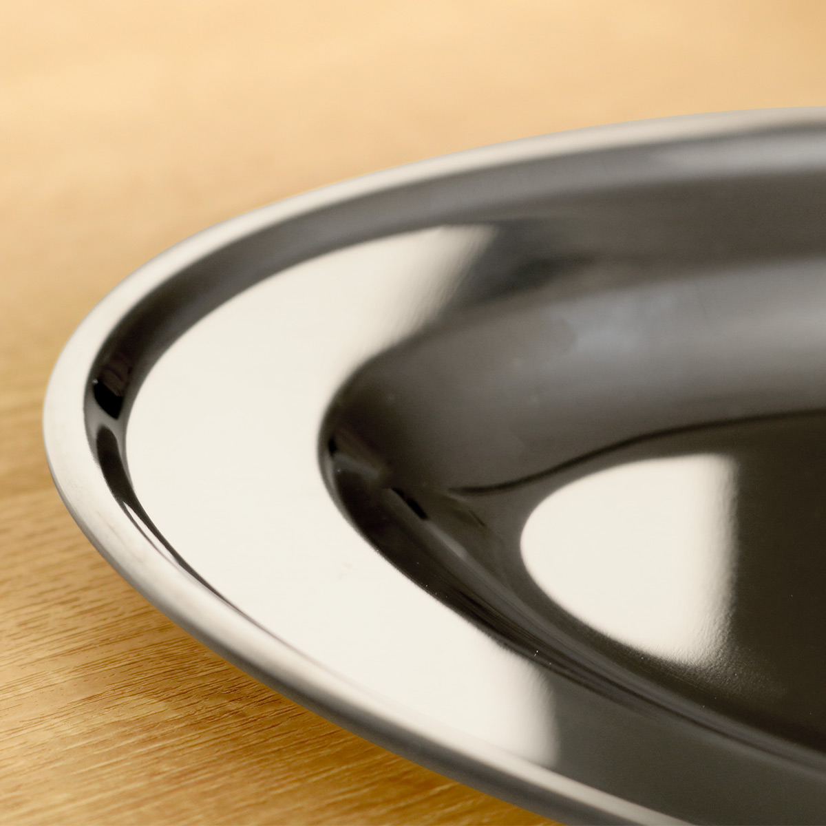 表面はつるりとした手触りです。重厚感のある艶めきが美しく、18-0ステンレスならではの丈夫さと、無駄な装飾のないシンプルなデザインで、長くご愛用いただけます。リムがしっかりとあるので、持ち運びもしやすいです。