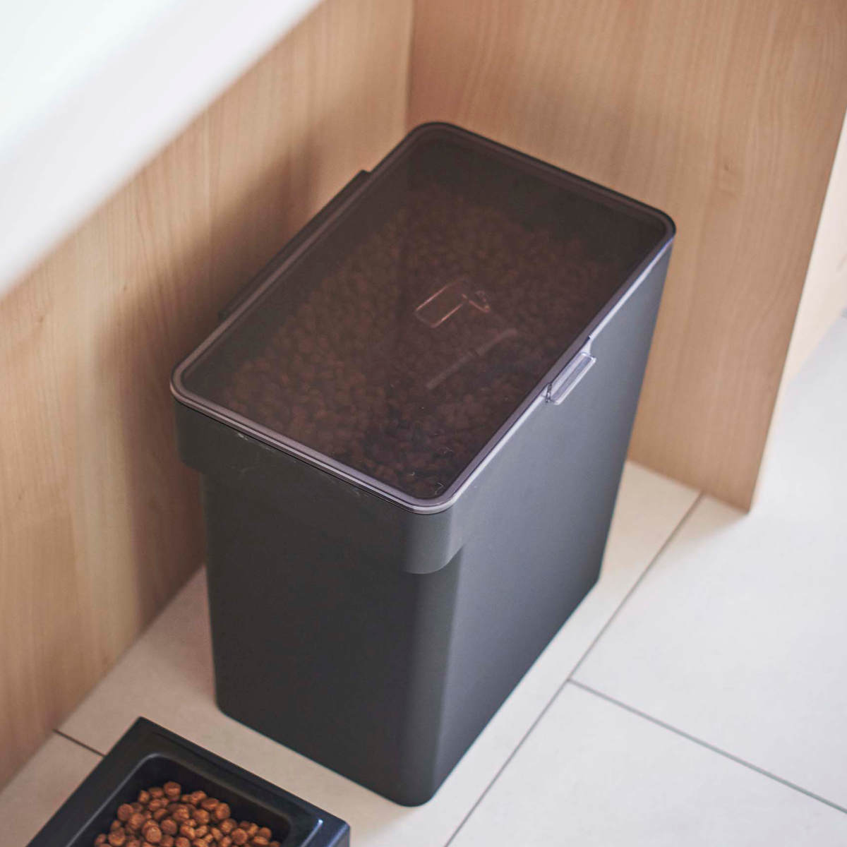 フタは全面に大きく開くので、ペットフードも取り出しやすく、補充の時もスムーズにできます。また透明フタなので閉めたままでも中の残量が一目で確認しやすく、補充のタイミングを見逃しません。