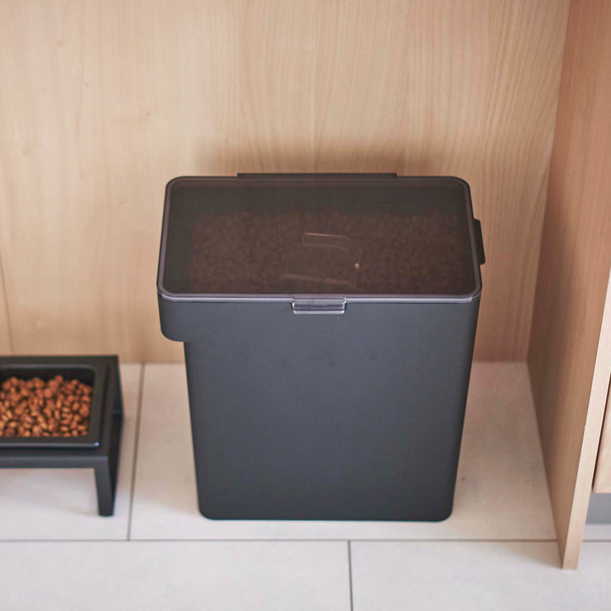 リビングやキッチンにそのまま置けるスタイリッシュなペットフードストッカーです。ドライペットフードを約6.5kg保存できます。パッキンでしっかり密閉されるので、ペットフードの湿気や酸化、臭い漏れを防いで品質を保ちます。