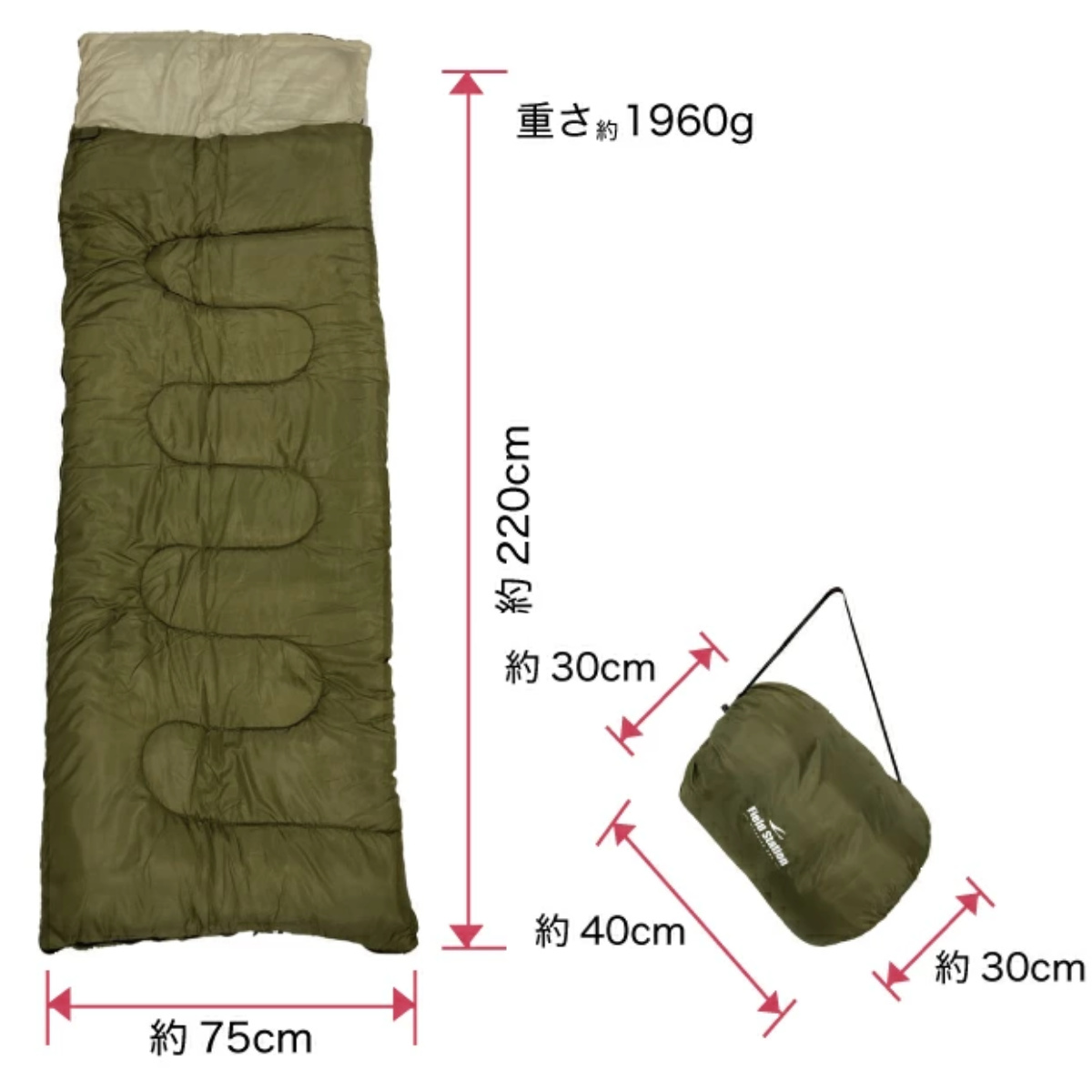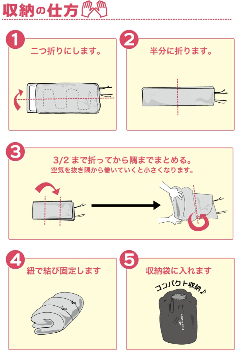 | 材質 | 表地:ポリエステル100% 裏地:ポリエステル100% 中綿:ポリエステル100% 収納袋:ポリエステル100% |