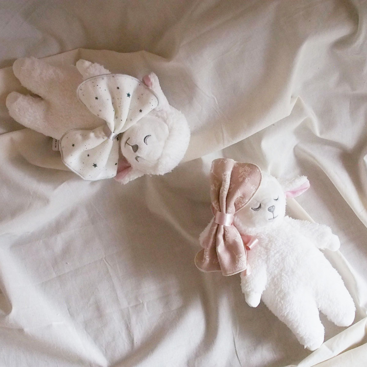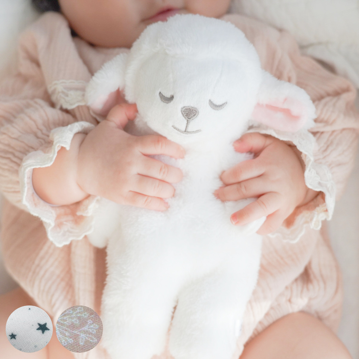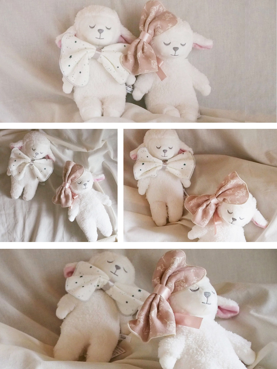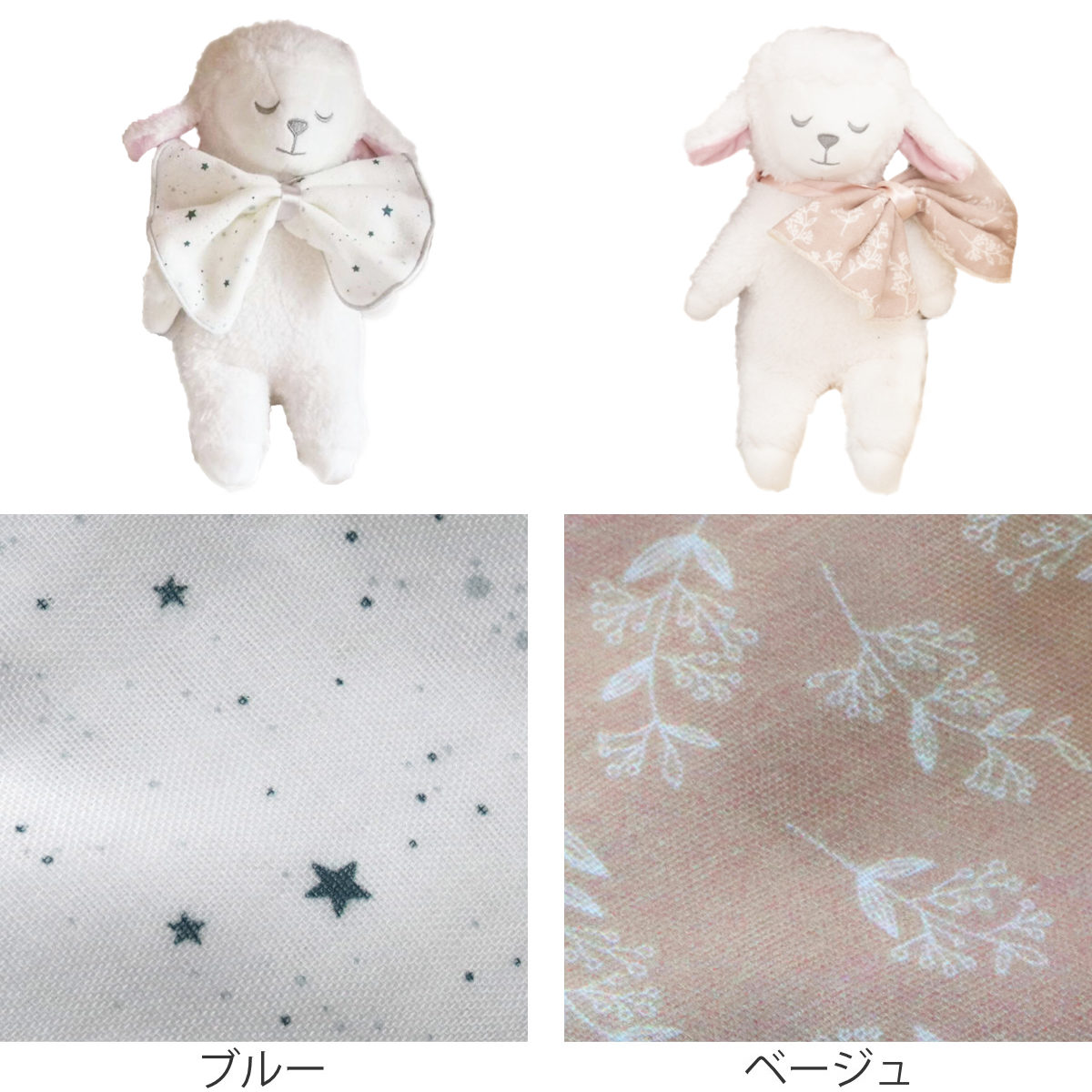 可愛らしいお顔の男の子と女の子のひつじさん、2種類からお選びいただけます。男の子のひつじさんにはスター柄、女の子のひつじさんにはボタニカル柄のミニハンカチが付属しています。ミニハンカチはそれぞれ、リボンの形になってひつじさんに可愛く取り付けられています。