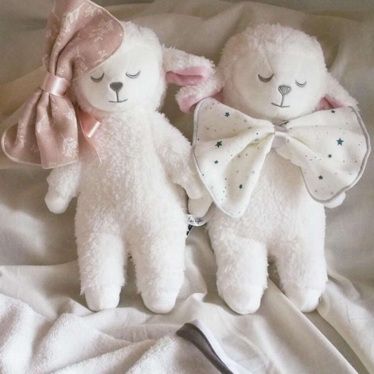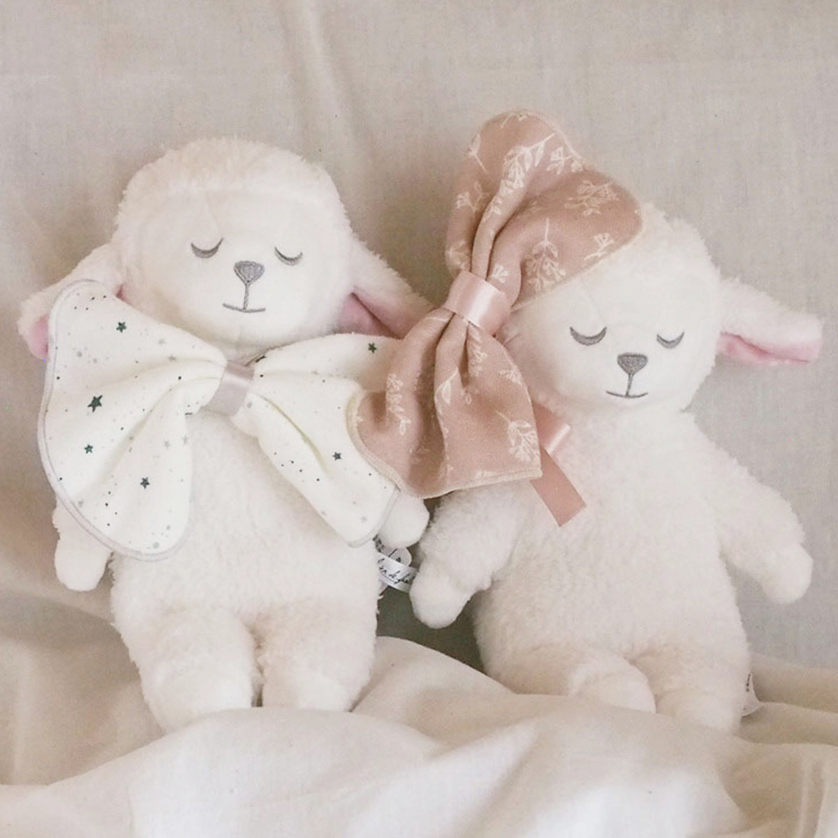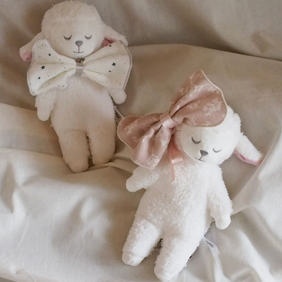 可愛らしいお顔の男の子と女の子のひつじさん、2種類からお選びいただけます。男の子のひつじさんにはスター柄、女の子のひつじさんにはボタニカル柄のミニハンカチが付属しています。ミニハンカチはそれぞれ、リボンの形になってひつじさんに可愛く取り付けられています。