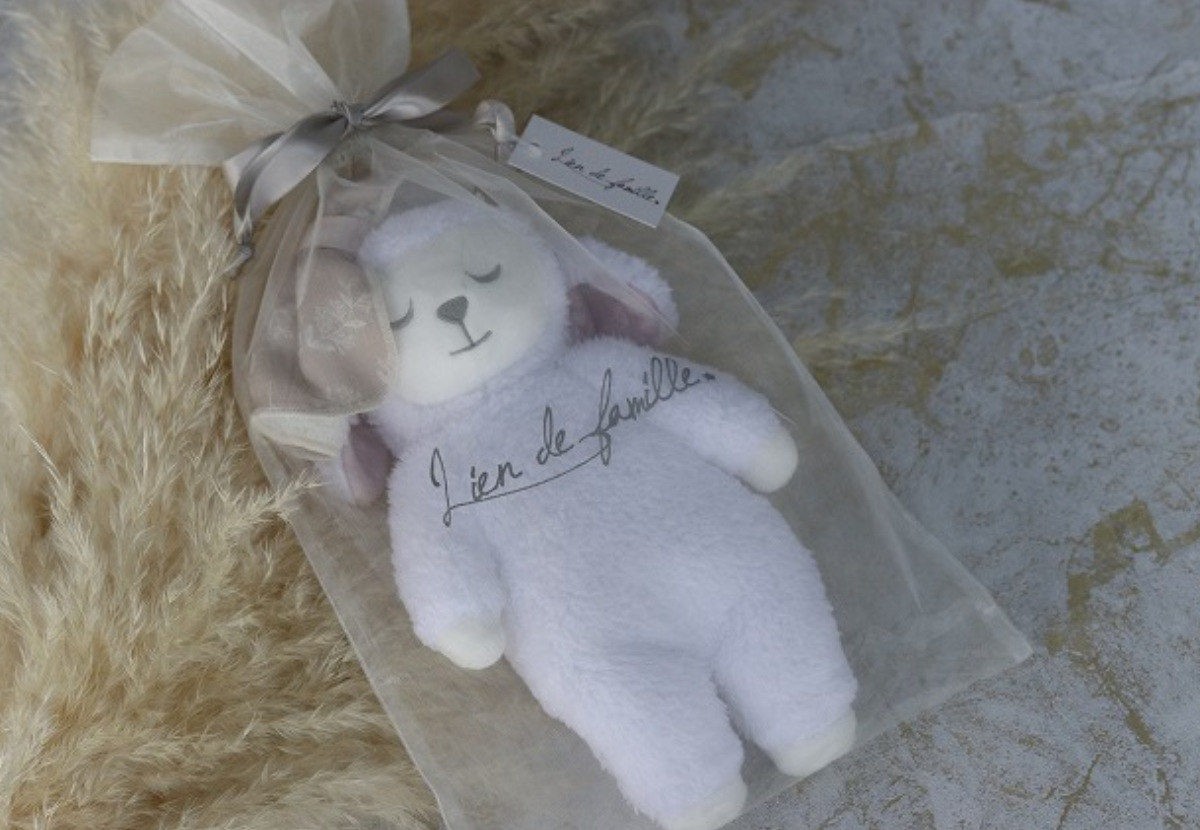 Lien de famille(リヤンドファミーユ )ロゴマーク入りの美しいオーガンジーの巾着袋に入れてお届けします。おもちゃ入れやお着替え入れに再利用していただけます。